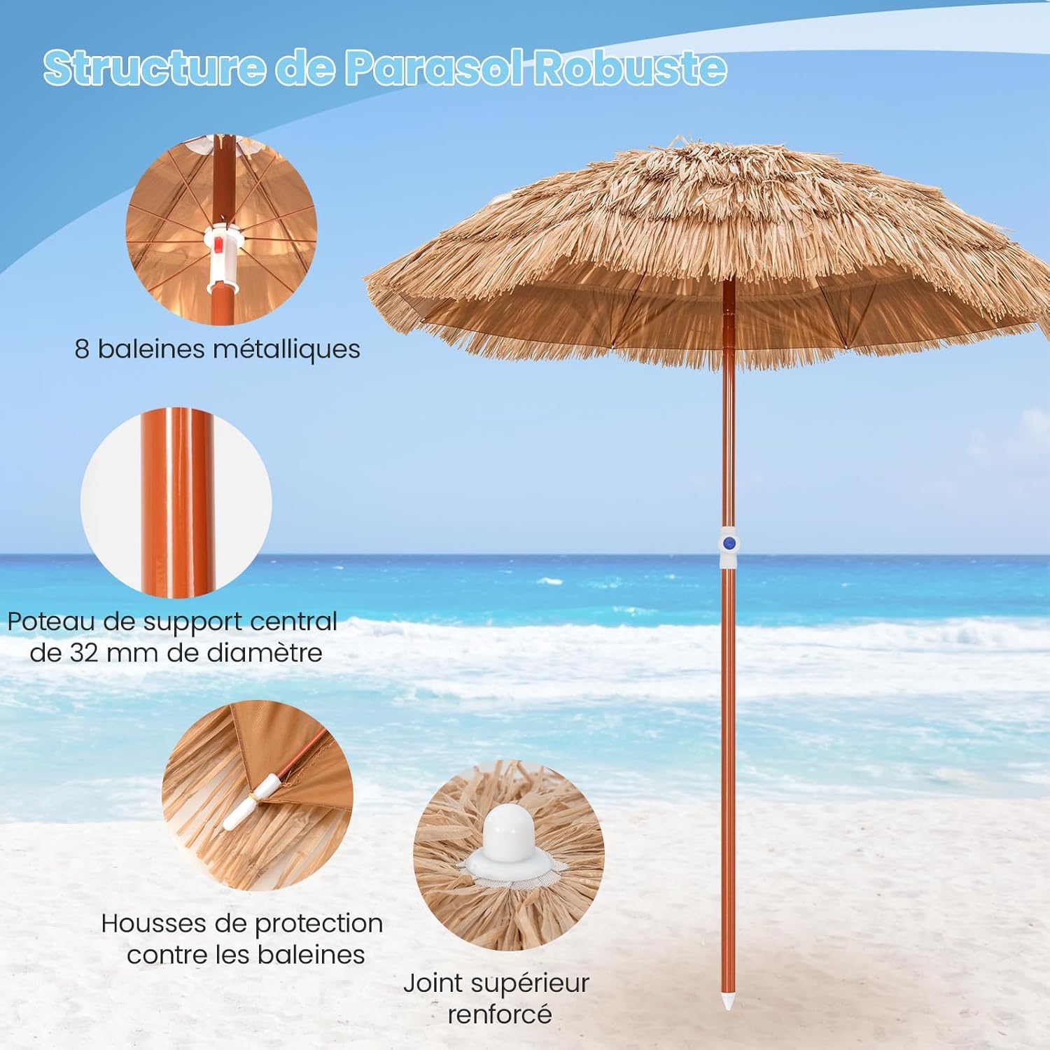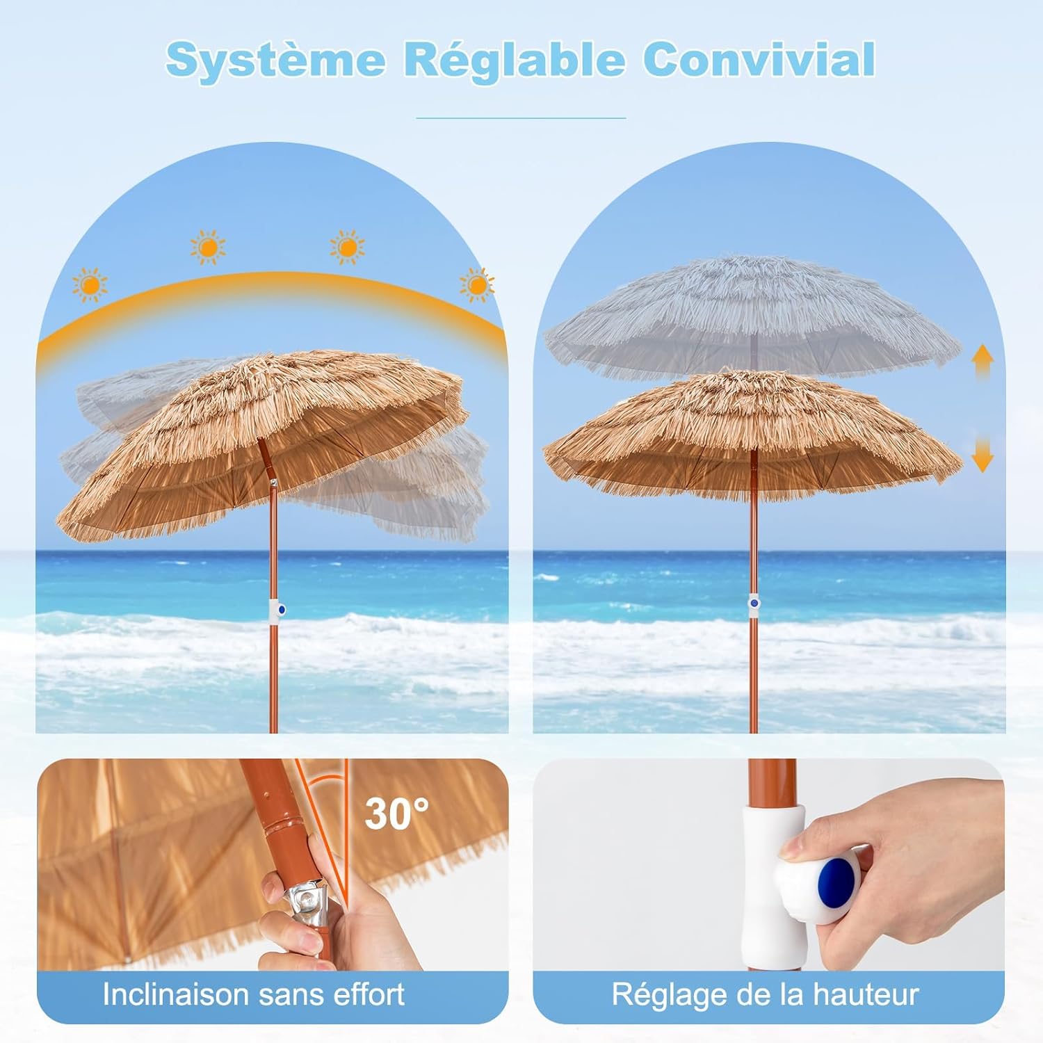 - Applications multiples : Ce parasol hawaïen apporte du confort à vos activités de plage tout en créant une ambiance tropicale. Vous pouvez l'installer dans différents endroits tels que les jardins, les patios et les terrasses pour vous détendre à l'ombre.