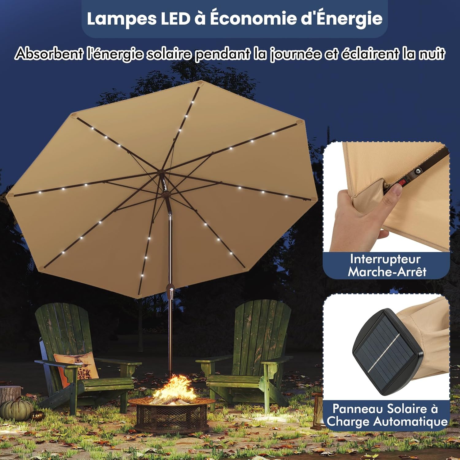 - 24 lampes à LED : Notre parapluie a un total de 8 baleines, chacune avec 3 lampes à LED, un total de 24 lampes à LED, l'énergie solaire peut être utilisée pour charger le parasol lorsqu'il y a suffisamment de soleil. Ce parasol avec LED bloquent la lumière du soleil et les rayons ultraviolets, et il s’éclaire dans la nuit.