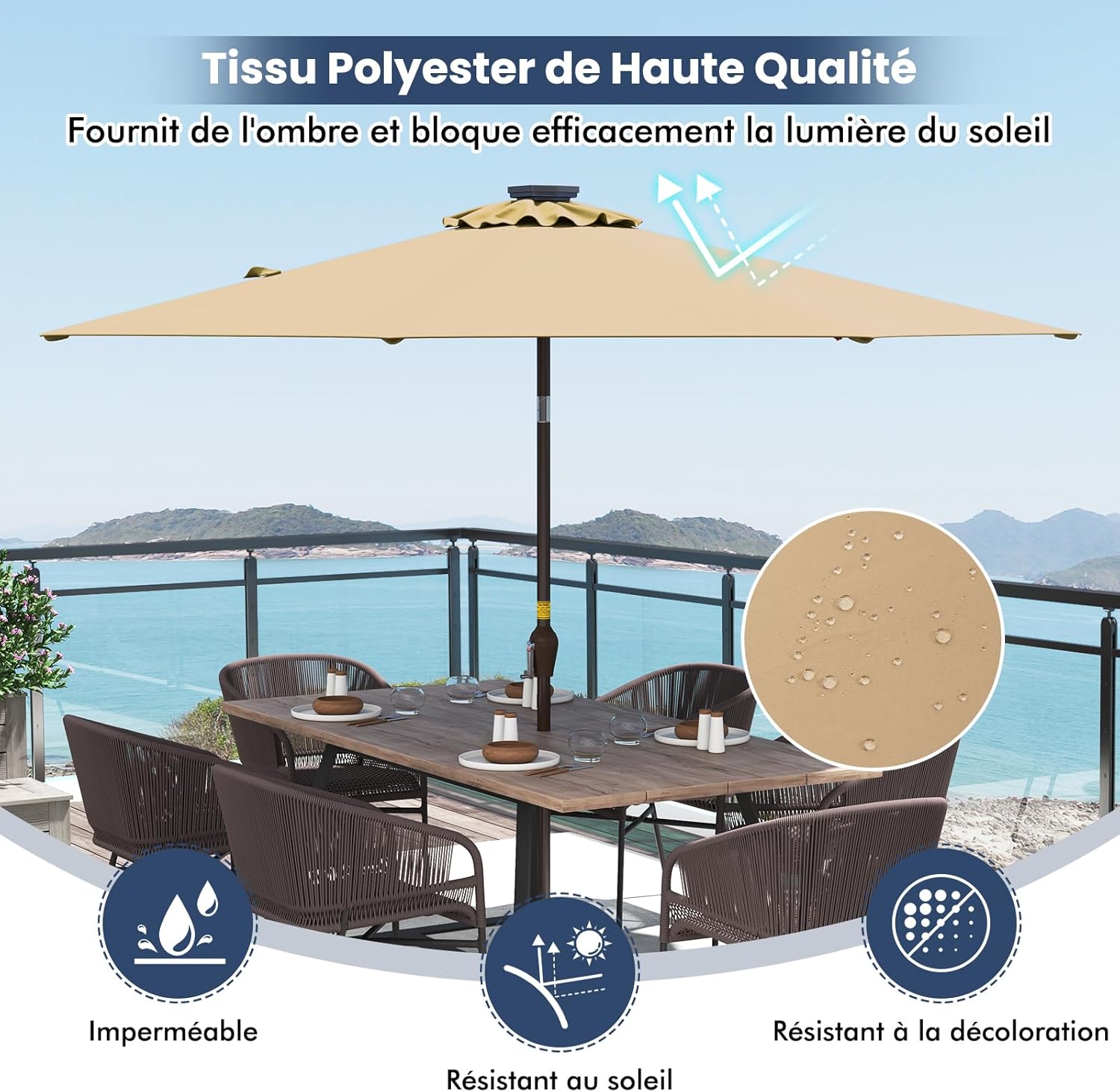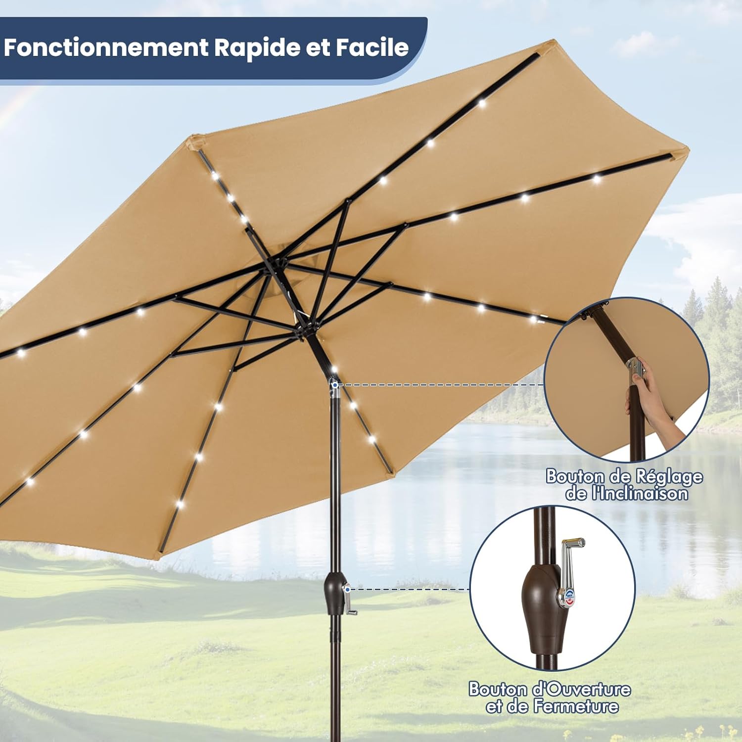 - Utilisation facile : Il vous suffit de tourner la manivelle, vous pouvez facilement ouvrir ce parasol inclinable en un seul geste, ce qui est pratique et permet de gagner du temps.