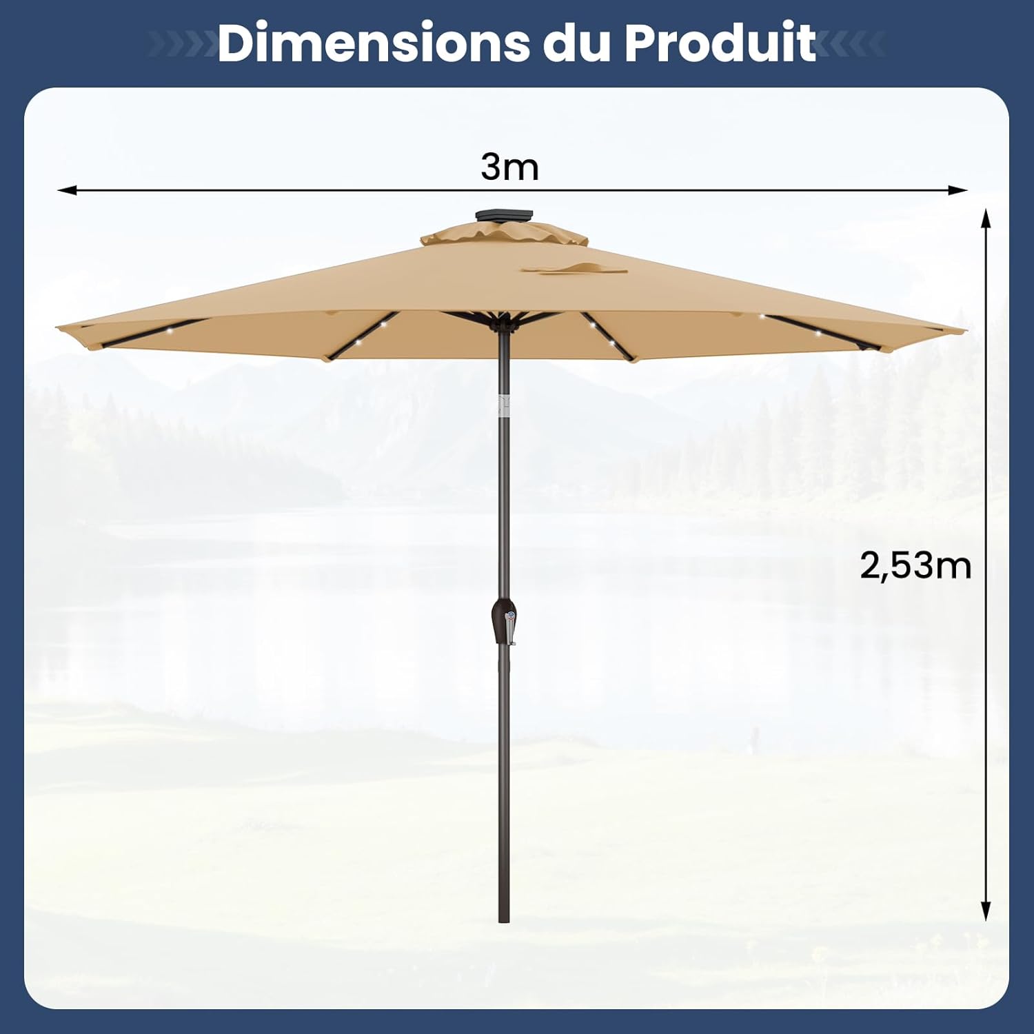 | Libellé | Parasol de jardin exterieur inclinable 8 baleines lumineux solaire 24led manivelle,base non incluse beige |