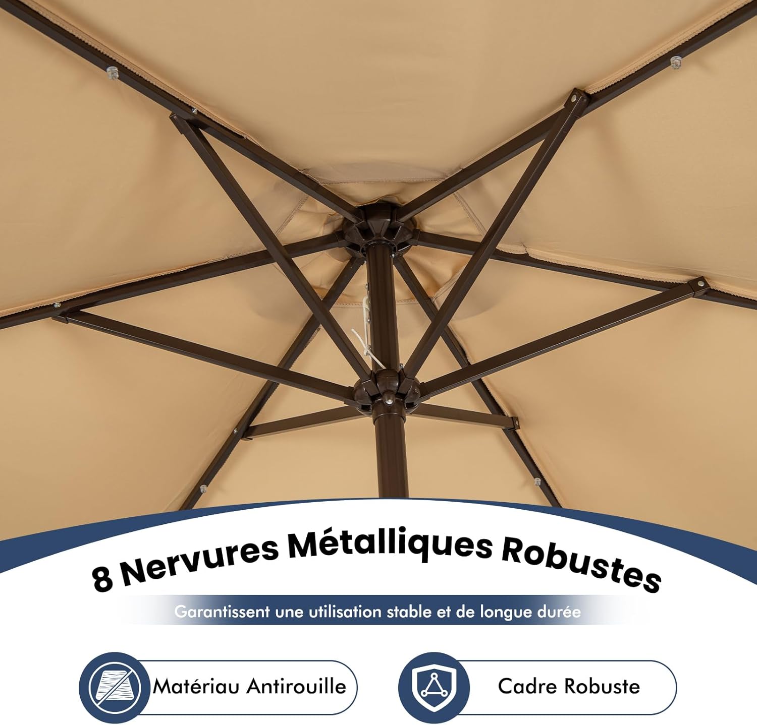 - Cadre Robuste : Tuyau en fer gras, ce parasol de balcon est solide et durable, il est difficile à casser, ce qui permet une longue durée de vie. Doté de 8 baleines, ce parasol de terrasse résiste bien au vent et s’effondre pas facilement et vous donner une garantie de sécurité.