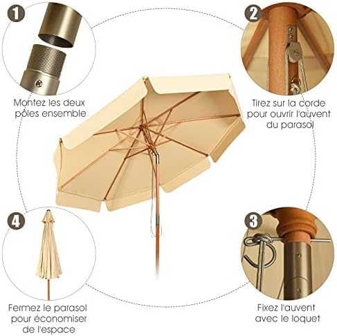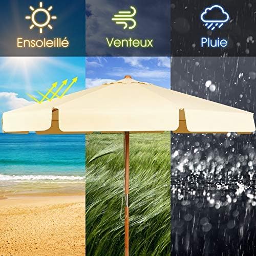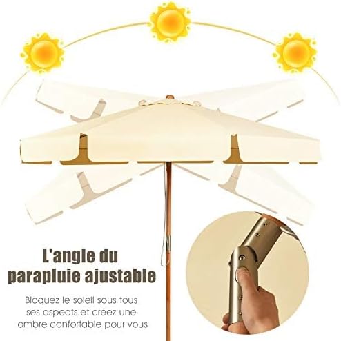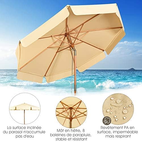 Très robuste, le poteau du parasol en hêtre de 44 cm de diamètre ne se cassent pas facilement même par temps extrême. Il y a une tête de direction en alliage de zinc de haute qualité au-dessus du poteau de parasol, vous pouvez facilement éviter la lumière directe du soleil en ajustant sa direction. De plus, ce parasol de jardin a un design de borture octogonale et un aspect beige élégant, adapté à un usage privé et commercial.