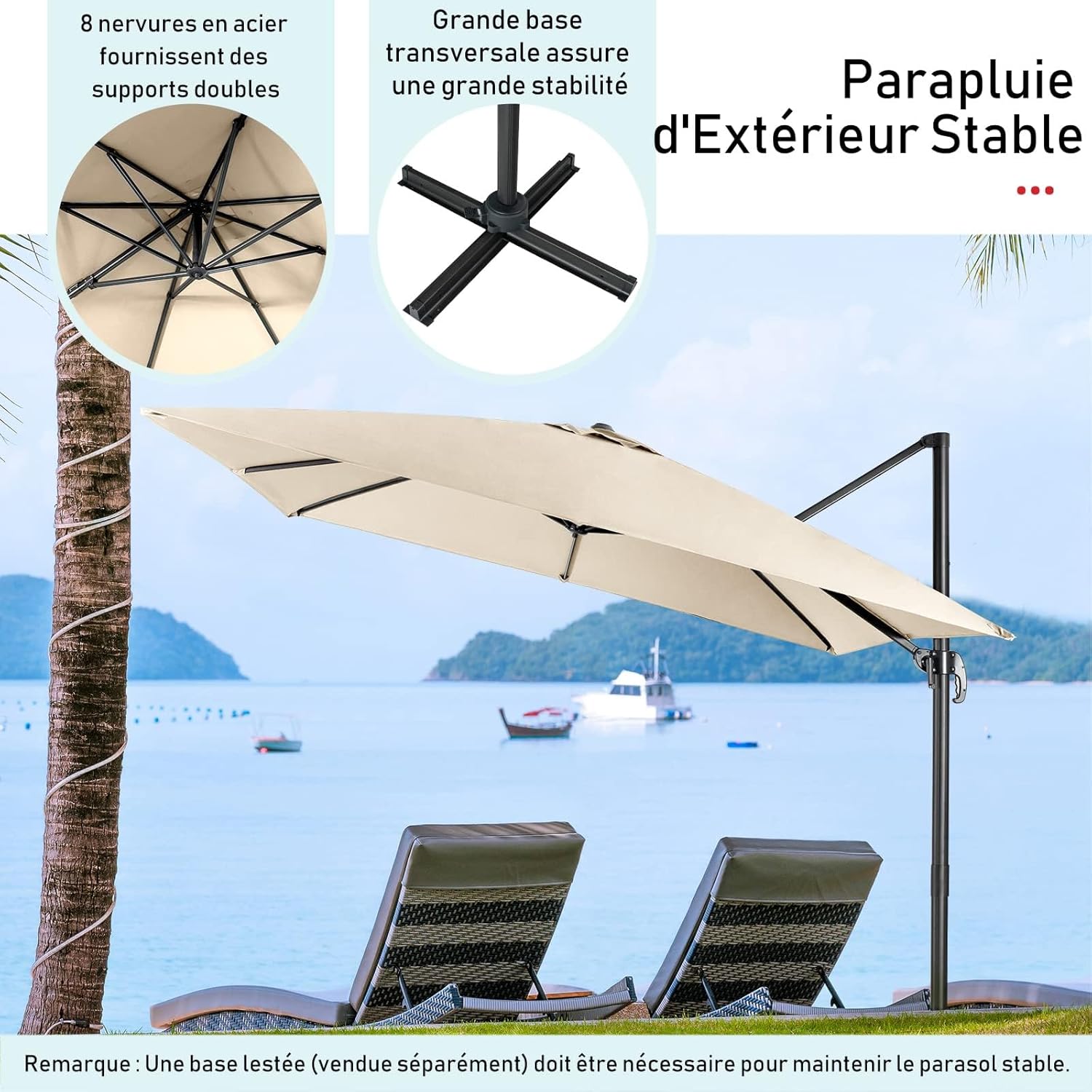 Parasol de jardin exterieur, parasol déporté avec manivelle, 8 baleines à double couche, rotation beige