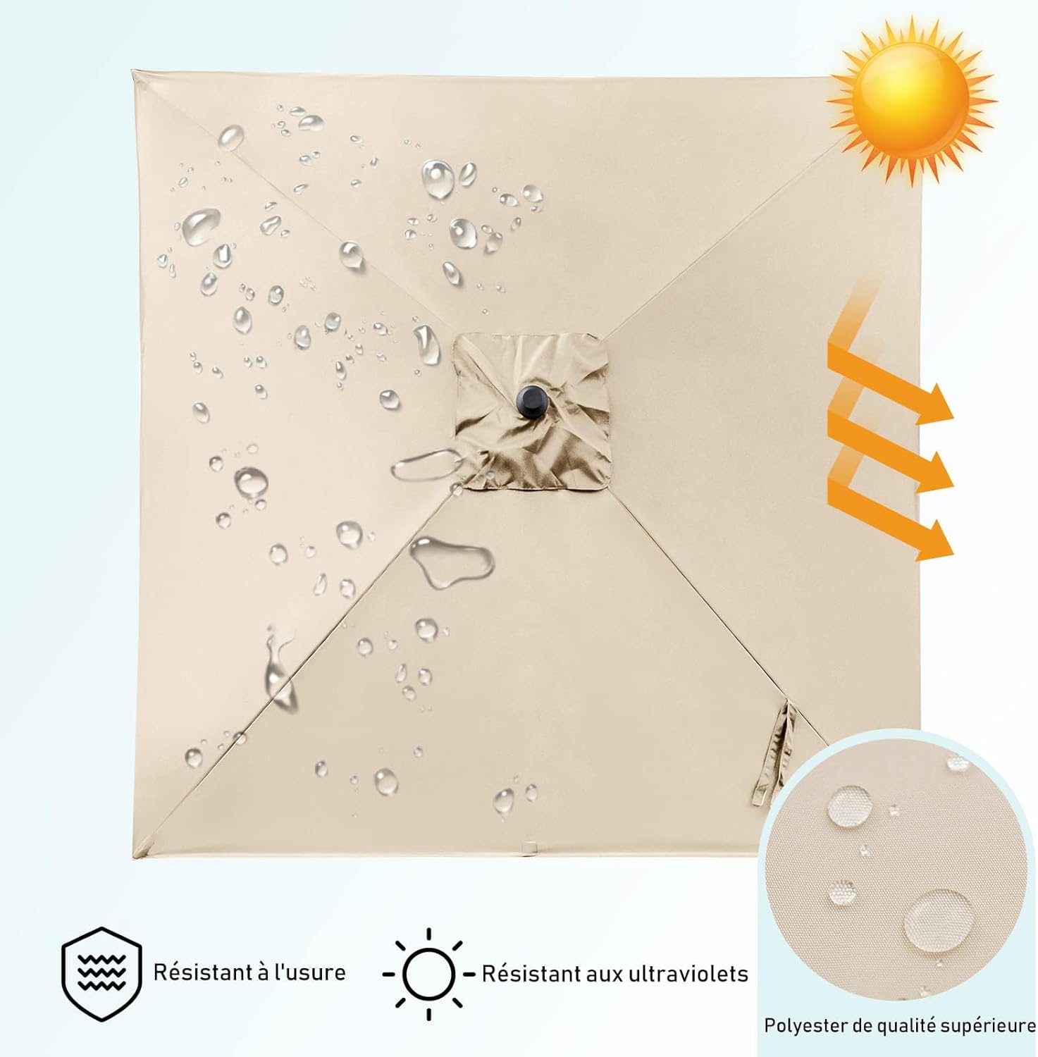 - Squelette Robuste & Construction Stable : Ce parasol d'extérieur est doté de baleines de barres en fer et à double couche pour assurer sa solidité et longue durée de vie. La base croisée maintient le parasol stable. En outre, vous pouvez utiliser une base lestée supplémentaire (non incluse) pour assurer une meilleure stabilité au parasol.