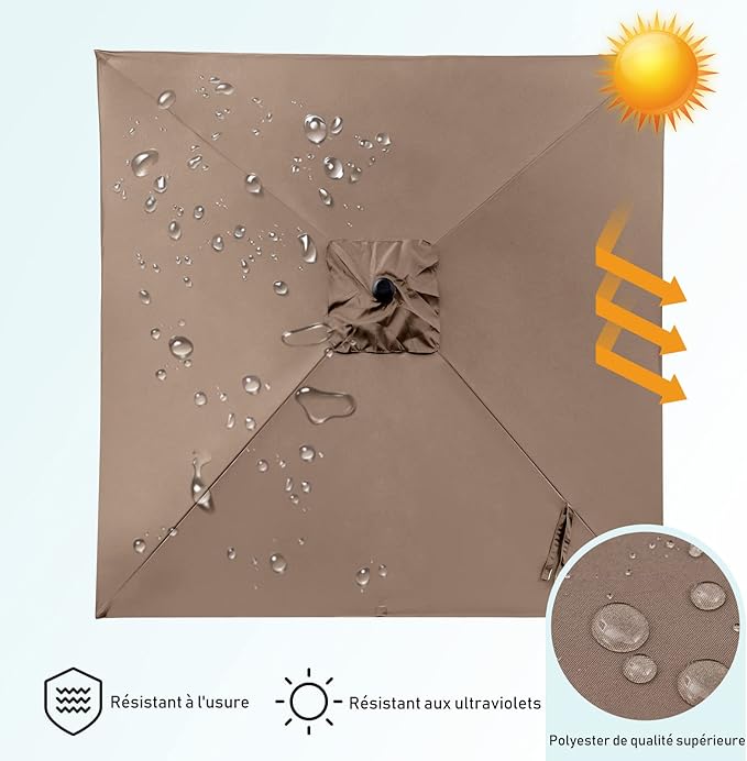 - Capacité d'Ombrage Supérieure : Ce parasol de jardin est fabriqué à partir de tissu en polyester de haute qualité, offrant une résistance à l'eau, aux UV et à la décoloration. Elle est également bien isolée pour offrir une expérience fraîche et confortable. Ce grand parasol de 3*3M vous apporte de l'ombre cet été.