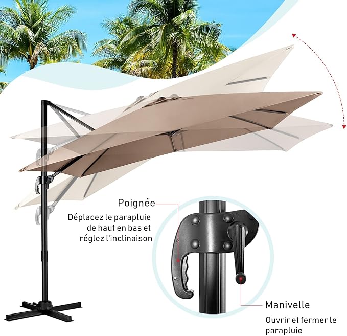 | Libellé | Parasol de jardin exterieur, parasol déporté avec manivelle, 8 baleines à double couche, rotation café |