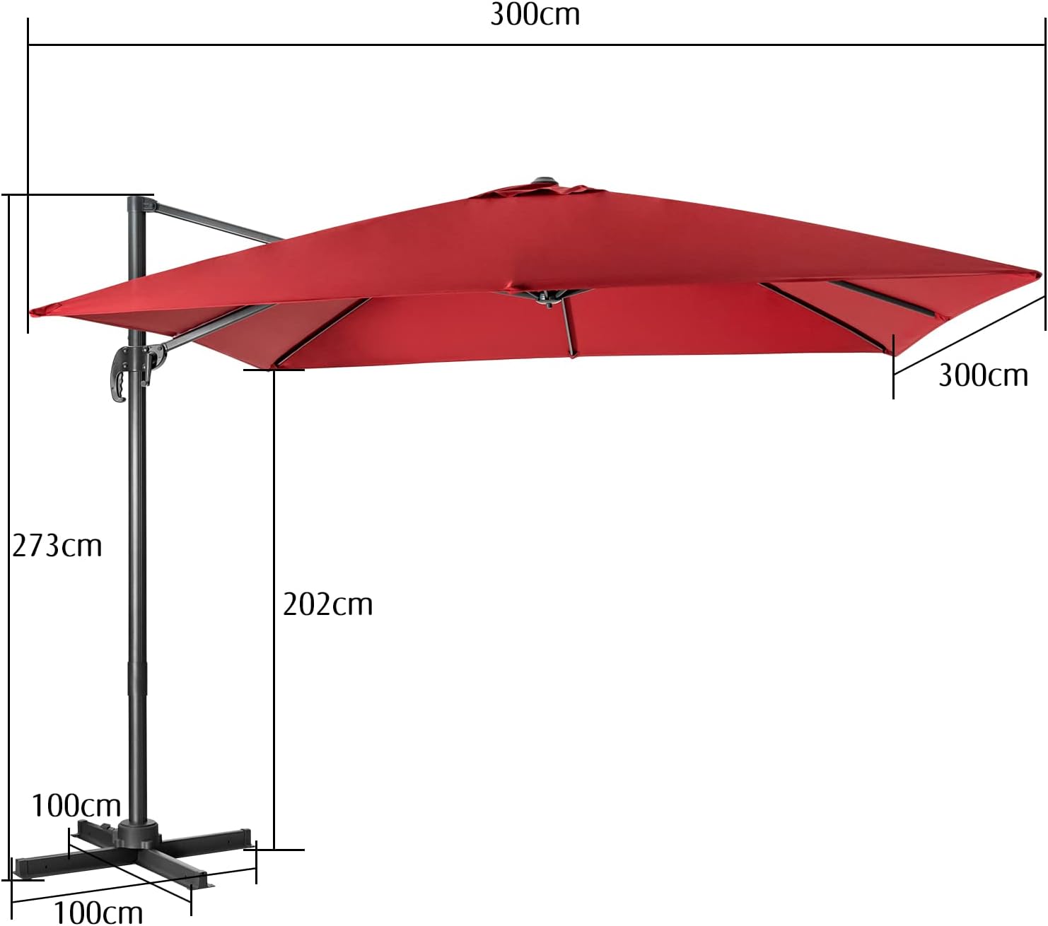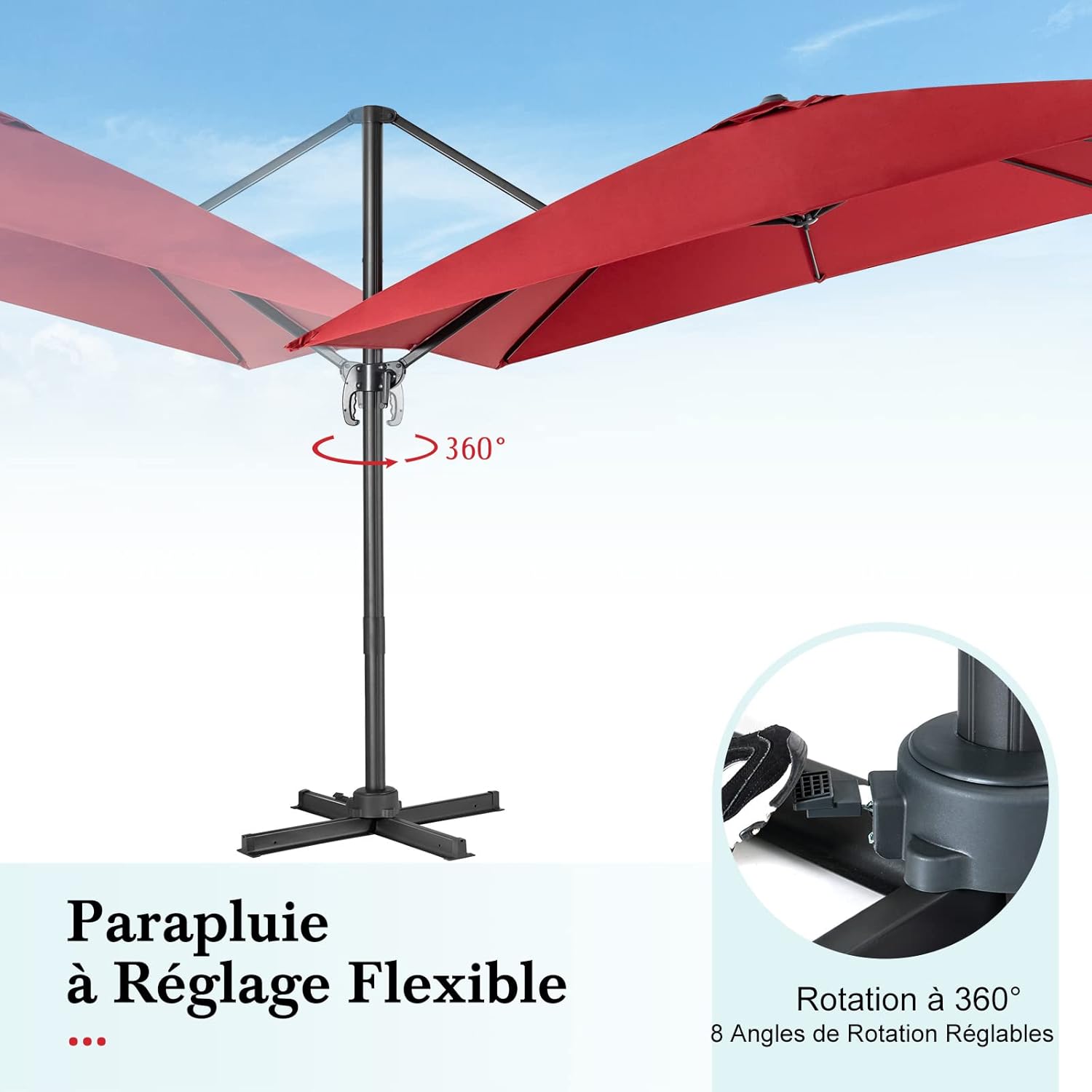 Parasol de jardin exterieur, parasol déporté avec manivelle, 8 baleines à double couche, rotation rouge