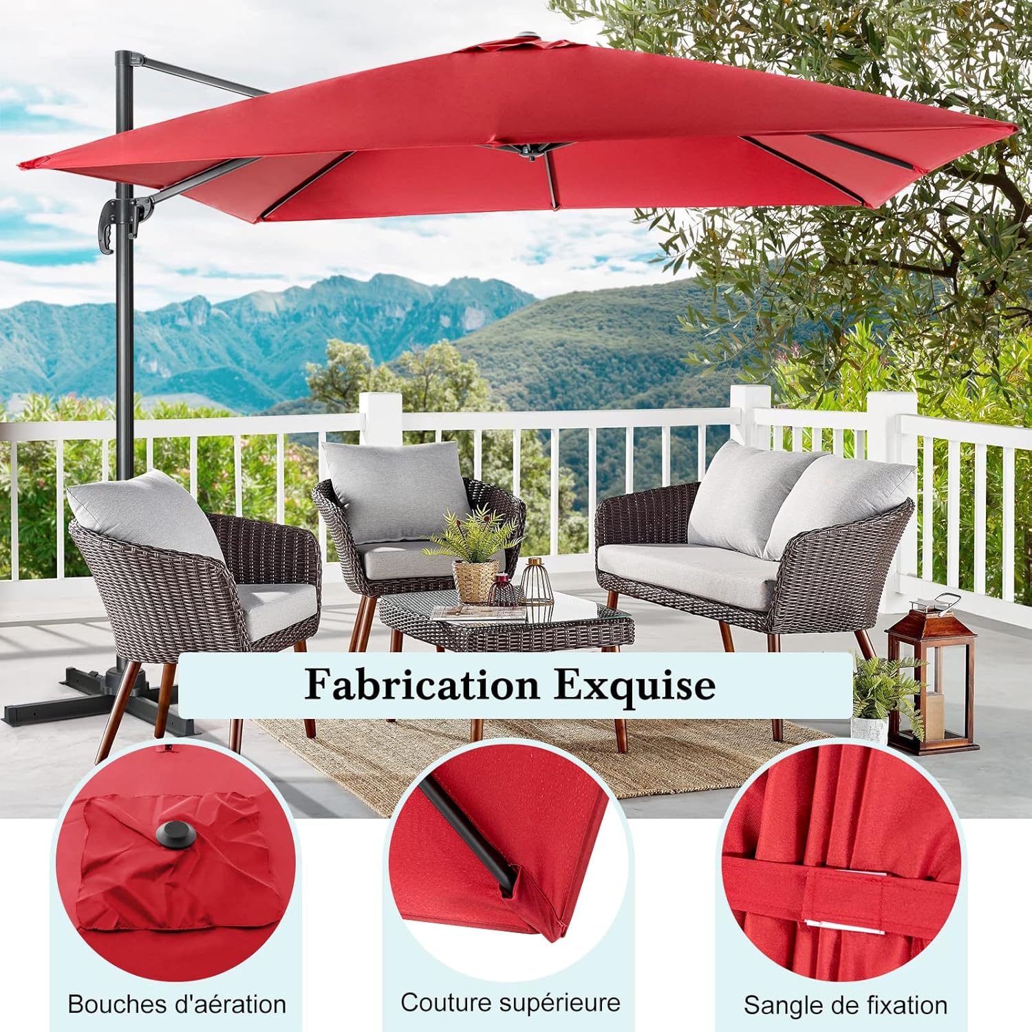 - Conceptions Intimes : Le dessus du parasol déporté est doté d'un trou de ventilation pour assurer la circulation de l'air pendant l'utilisation. La poignée sur le poteau vous permet d'ouvrir ou de fermer le parasol carré avec facilité et la sangle vous aide aussi à le ranger facilement.
