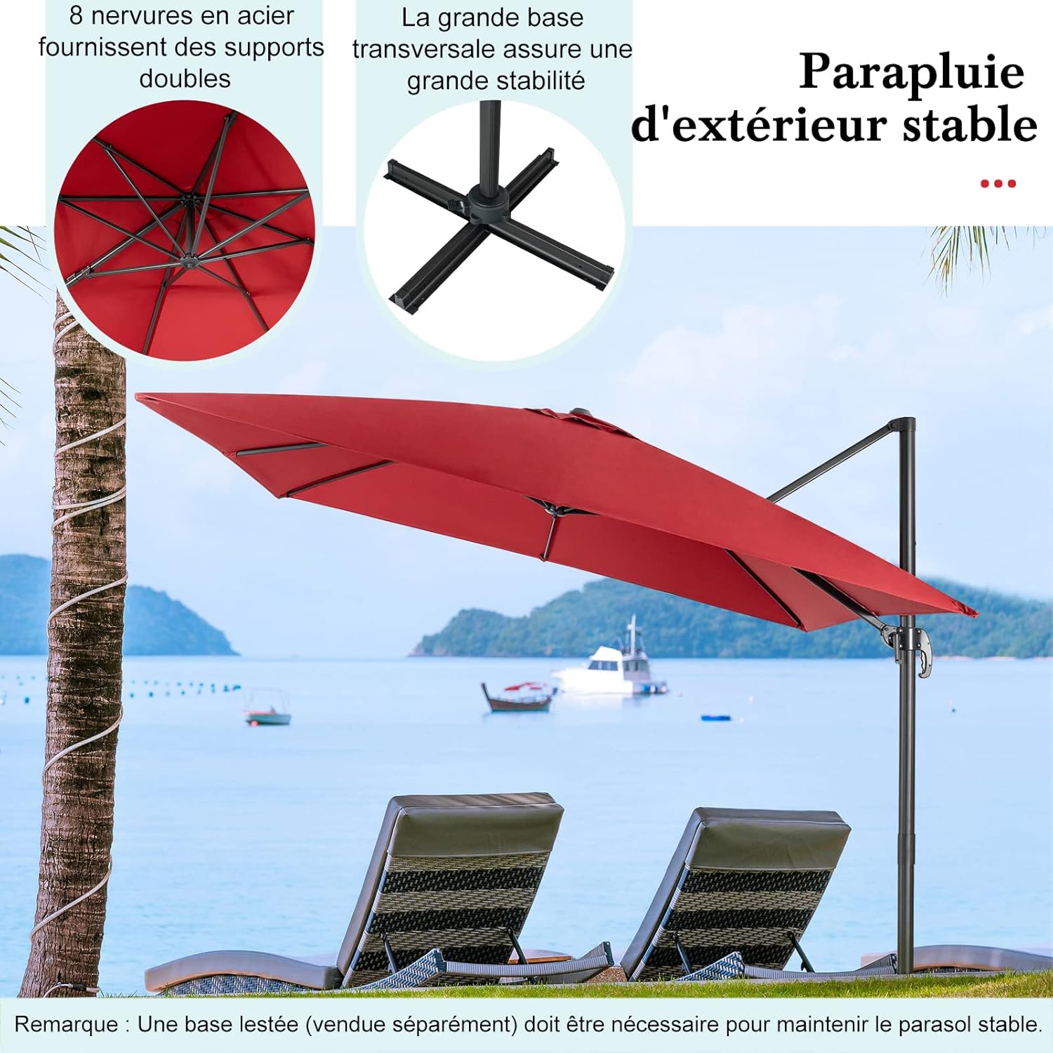 | Libellé | Parasol de jardin exterieur, parasol déporté avec manivelle, 8 baleines à double couche, rotation rouge |