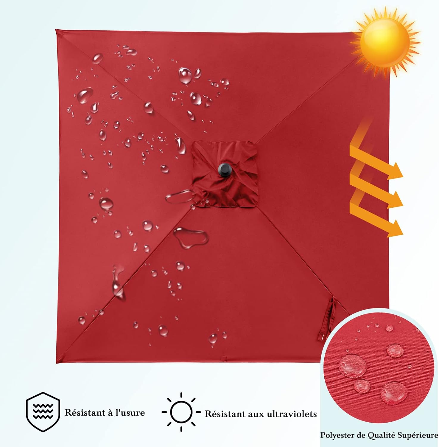 - Capacité d'Ombrage Supérieure : Ce parasol de jardin est fabriqué à partir de tissu en polyester de haute qualité, offrant une résistance à l'eau, aux UV et à la décoloration. Elle est également bien isolée pour offrir une expérience fraîche et confortable. Ce grand parasol de 3*3M vous apporte de l'ombre cet été.