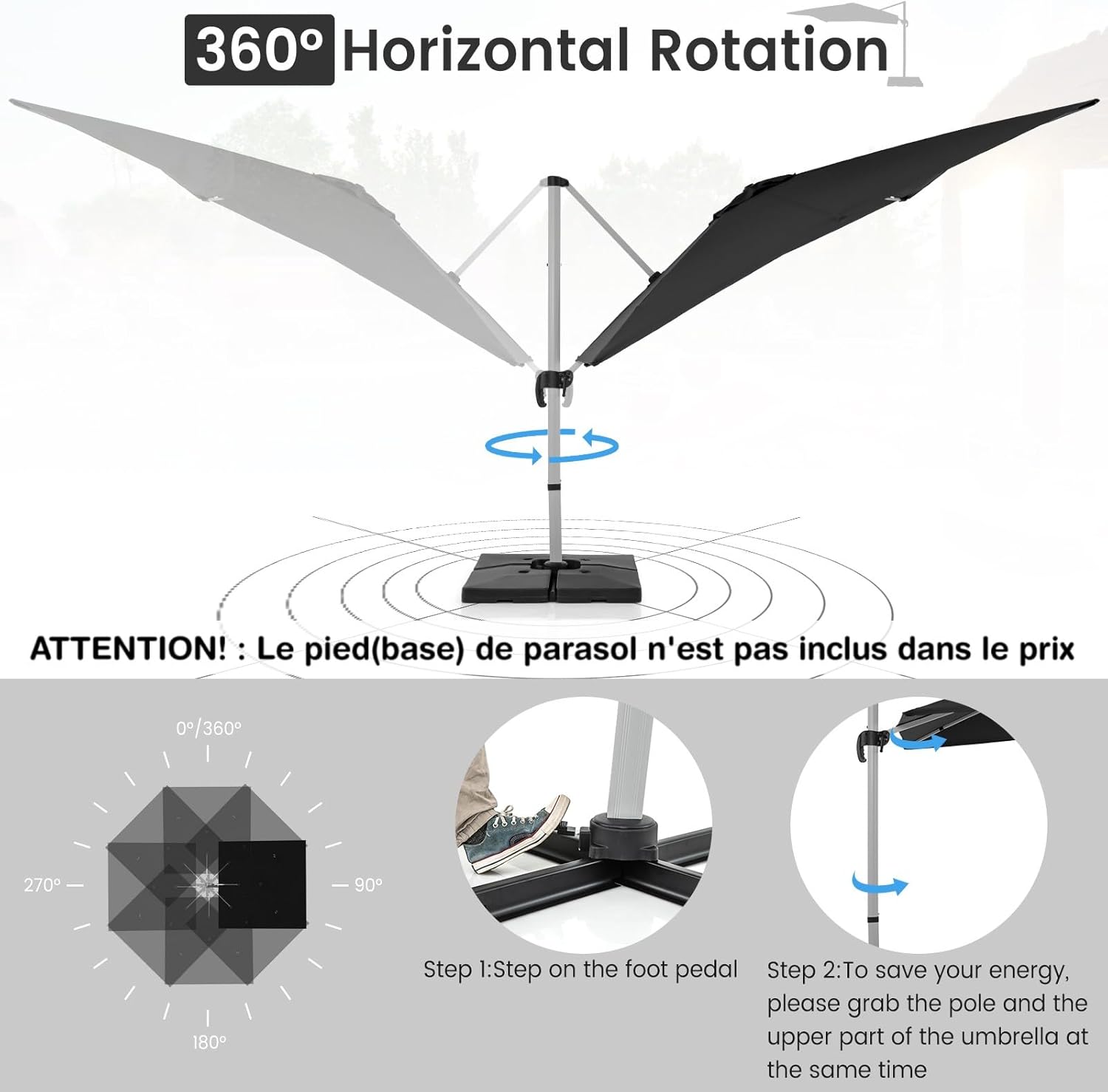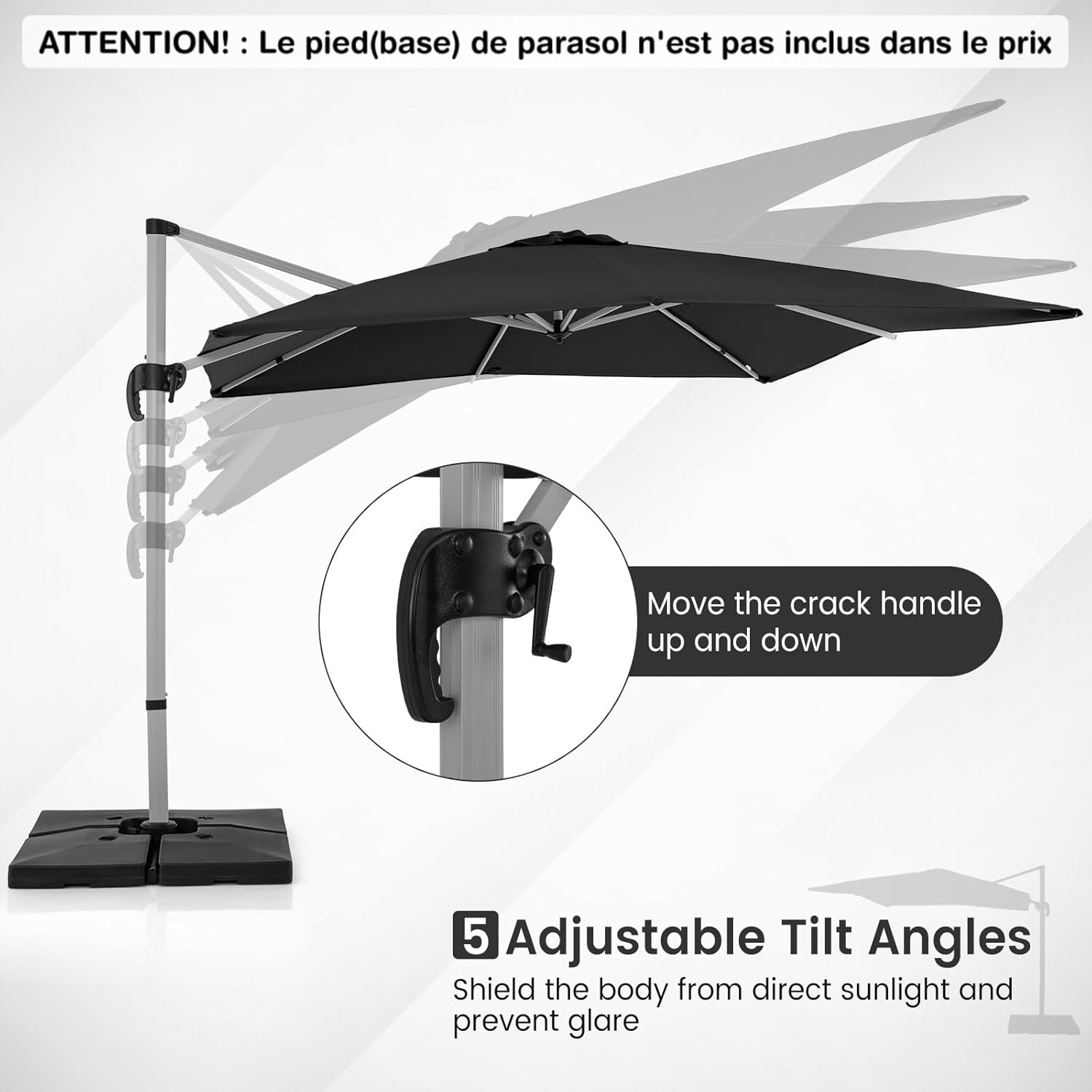 - Fonctionnalités Polyvalentes : Doté d'une rotation à 360°, ce parasol déporté permet de suivre le soleil tout au long de la journée, offrant une protection optimale en tout moment. Les 5 angles d'inclinaison réglables via une manivelle vous permettent de personnaliser parfaitement l'ombre selon vos besoins.