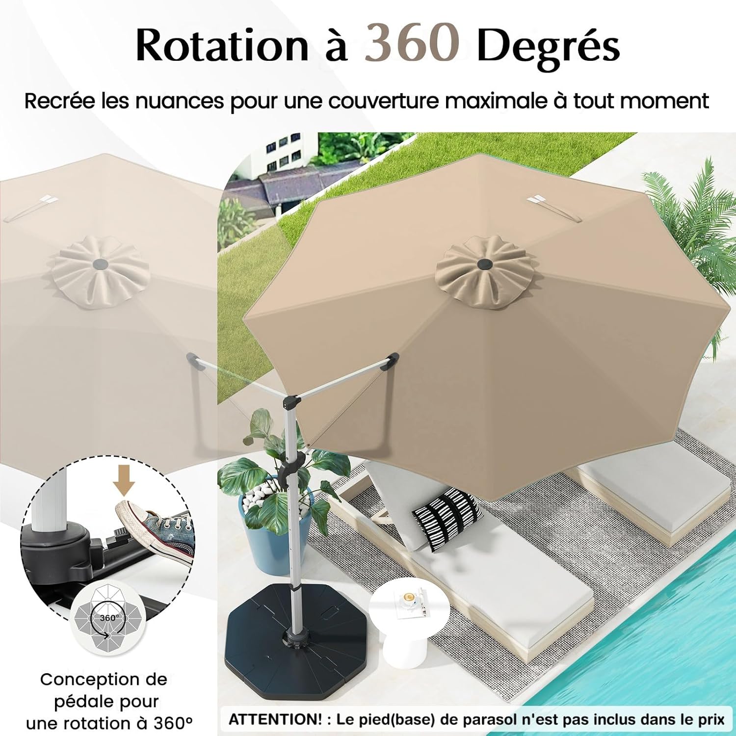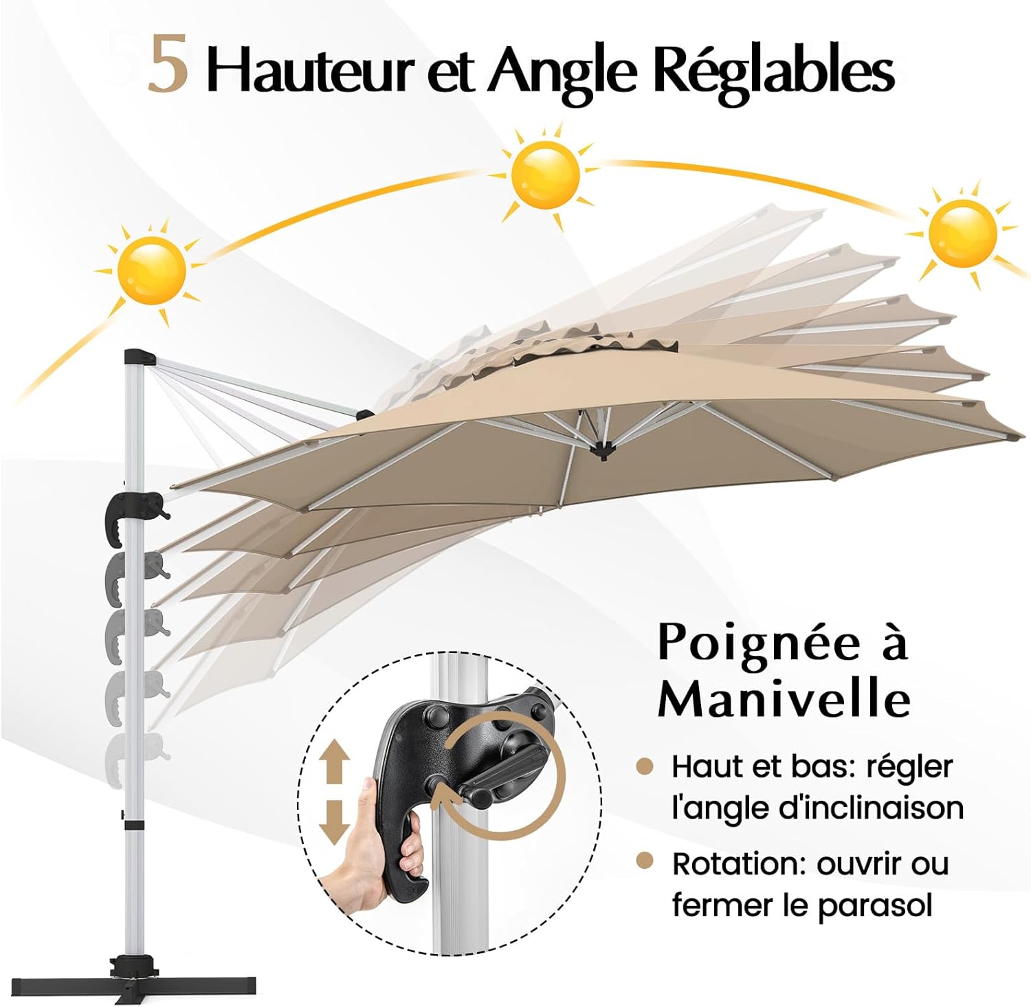 - Rotation à 360° et Inclinaison Réglable : Faites pivoter ce parasol en porte-à-faux à 360 degrés via la pédale pour profiter d'une couverture solaire complète tout au long de la journée, vous protégeant du soleil sous n'importe quel angle. Le système de manivelle facilite l'ouverture et la fermeture, et la conception unique de la poignée permet également de régler l'inclinaison sur 5 positions sans effort.