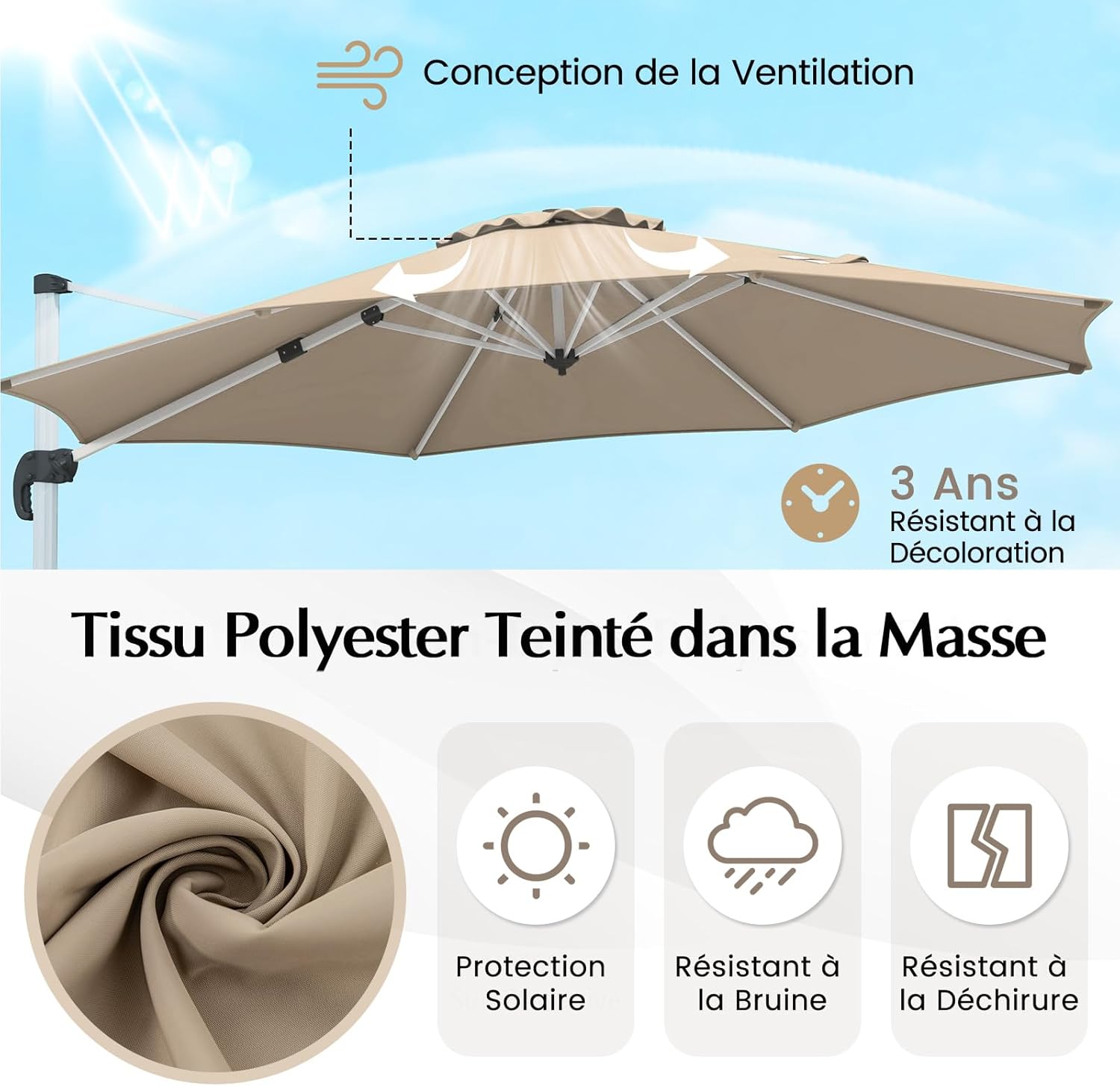 - Auvent de Qualité Supérieure : Fabriqué à partir de tissu polyester teint et en fil de qualité supérieure, l'auvent du parasol de jardin assure une protection solaire supérieure et une résistance à l'usure durable pour un plaisir prolongé en plein air. De plus, il résiste à la décoloration et conserve son aspect impeccable au fil du temps.