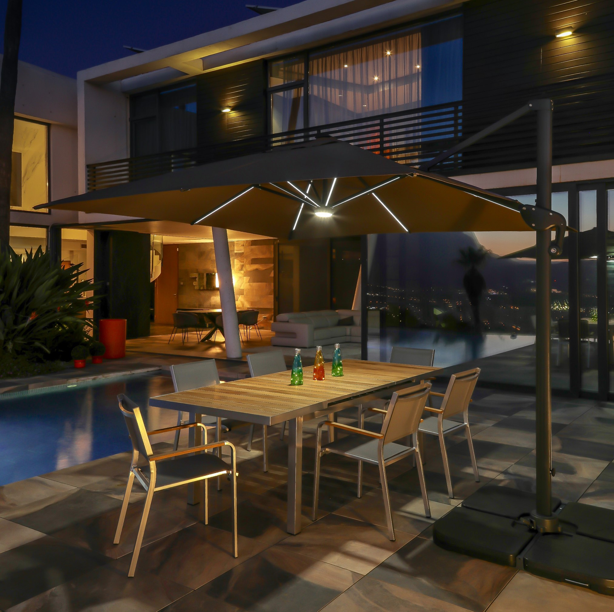 Structure aluminium, toile en polyester 180 grs/m2, multi-positions d'inclinaison, rotation à 360 degrés, éclairage solaire avec Leds,rechargeable avec prise USB, pieds en croix vendu sans dalles de lestage. Dimensions du produit monté : L x l x H en cm : 300x300x266 cm