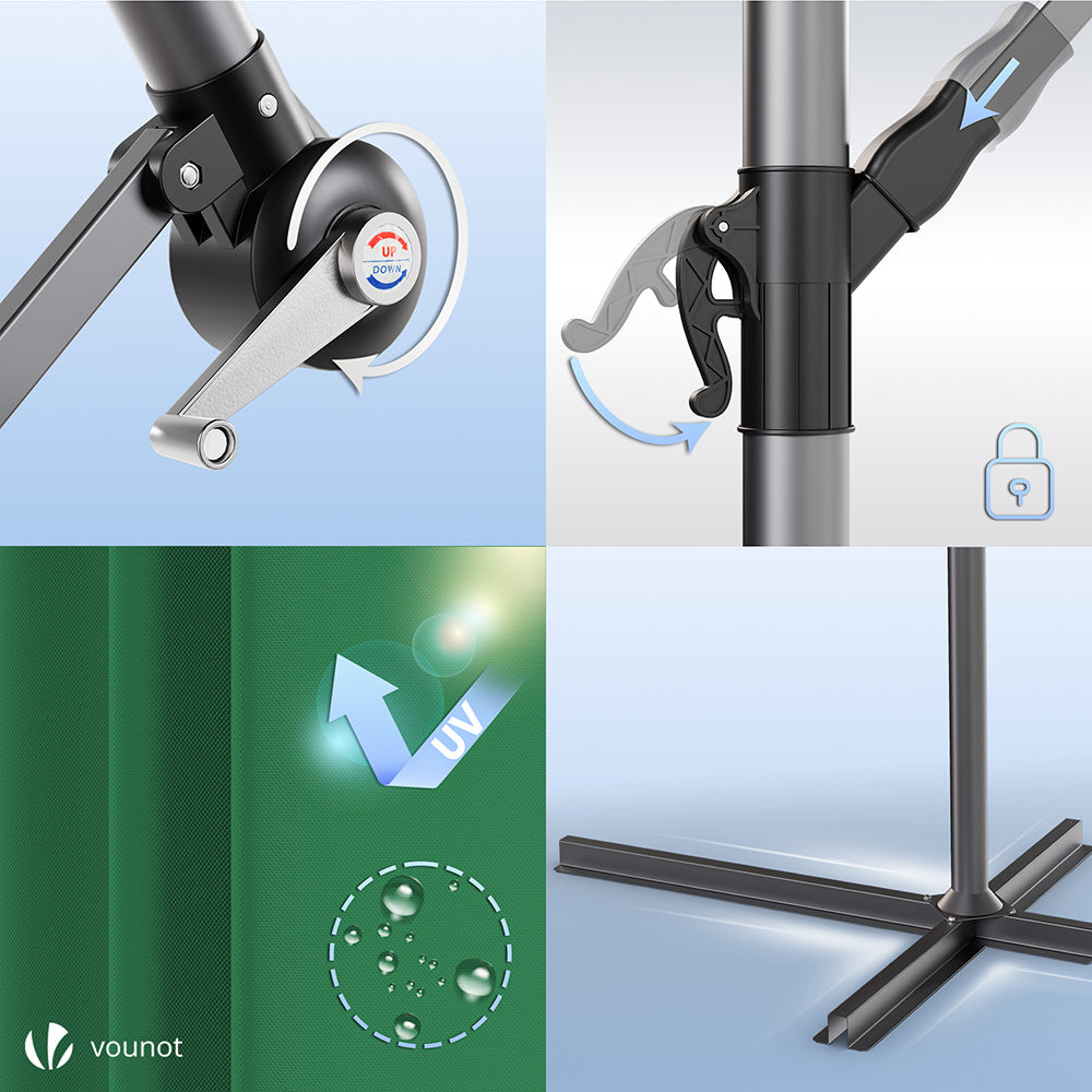 - Notre parasol rotatif est conçu pour ajuster la hauteur et l’angle d’inclinaison de la toile.