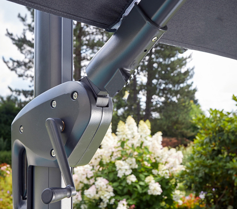 Cet élégant parasol de 3x3 m est constitué d'aluminium de couleur anthracite et se monte facilement et seul.