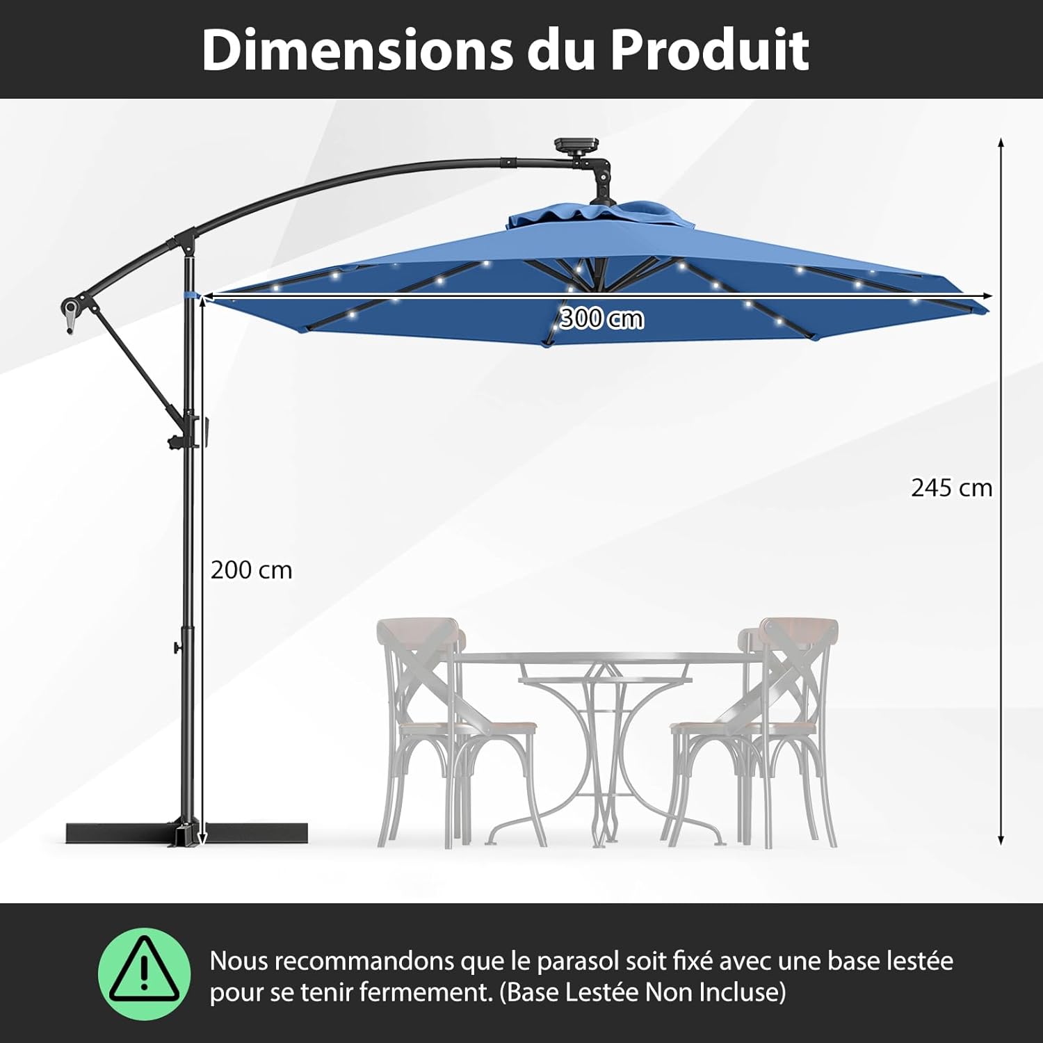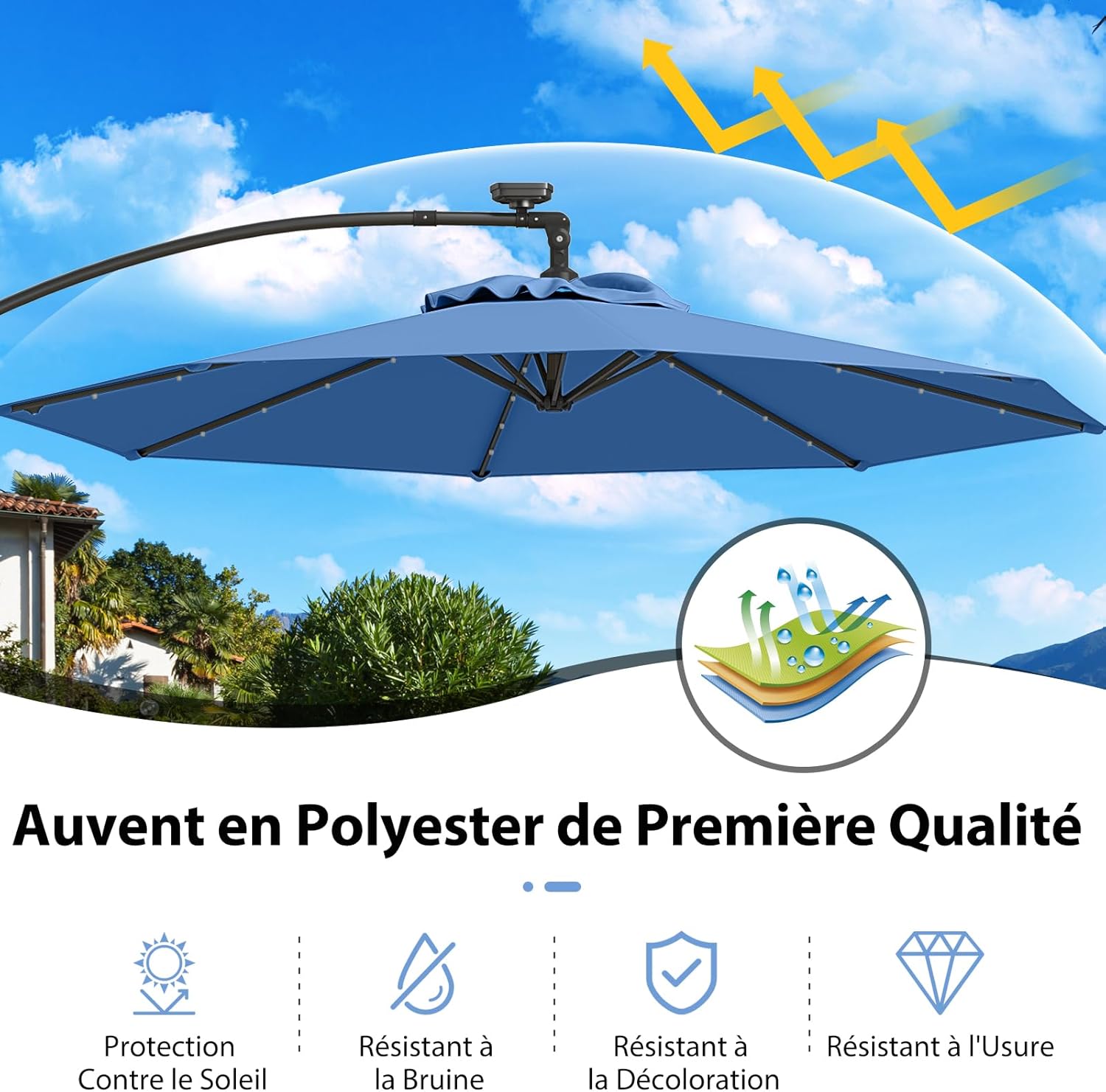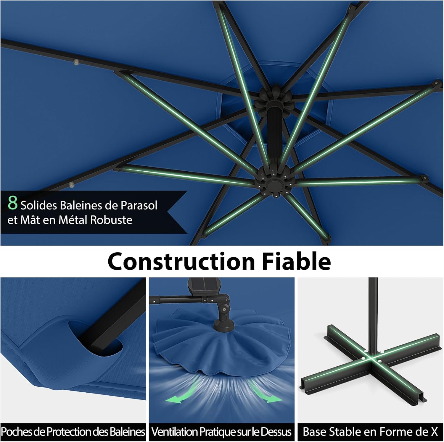 | Libellé | Parasol deporte avec 32 led solaires, parasol de jardin extérieur 8 baleines base non incluse bleu |