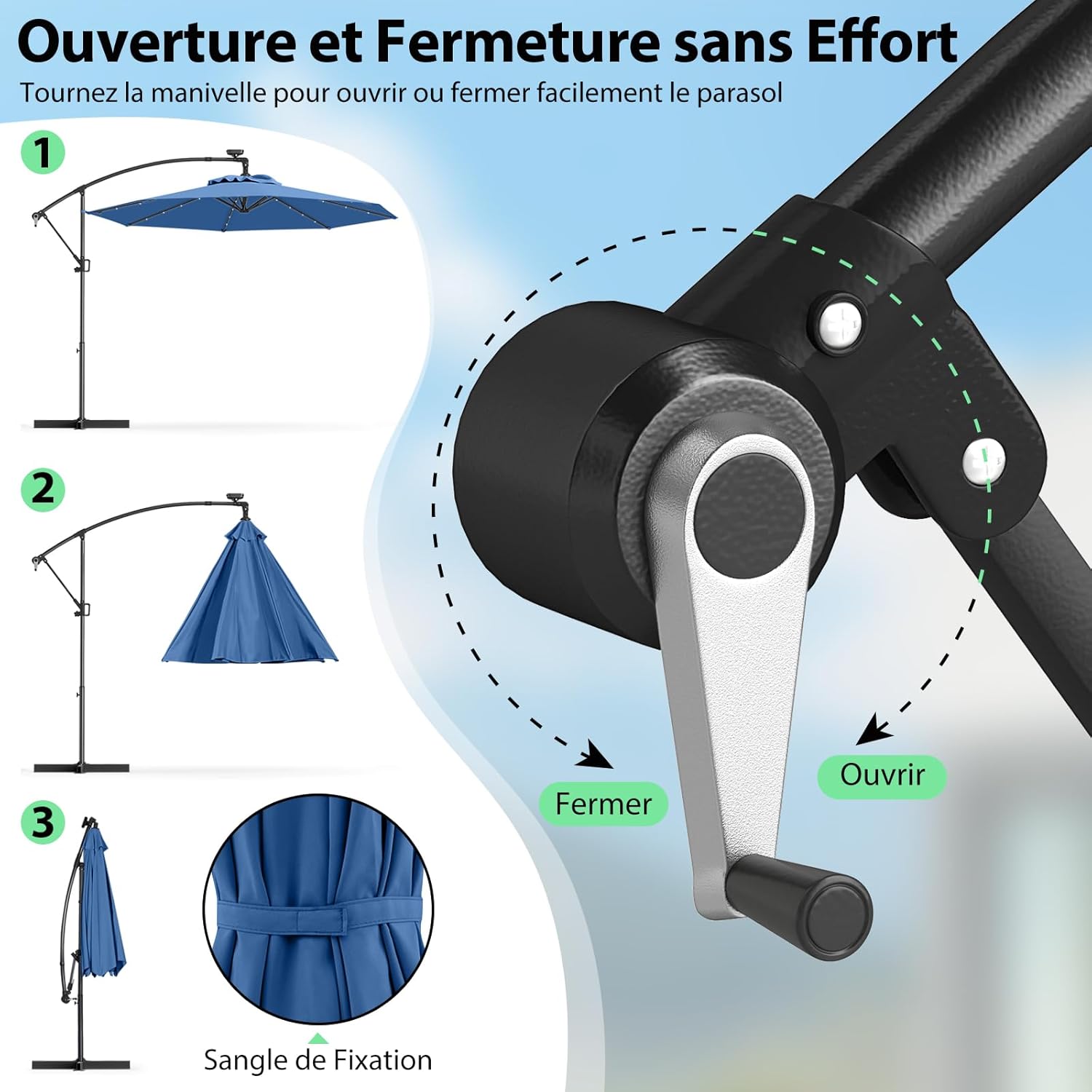 Manivelle peut contrôler l’ouverture et la fermeture du parasol sans effort