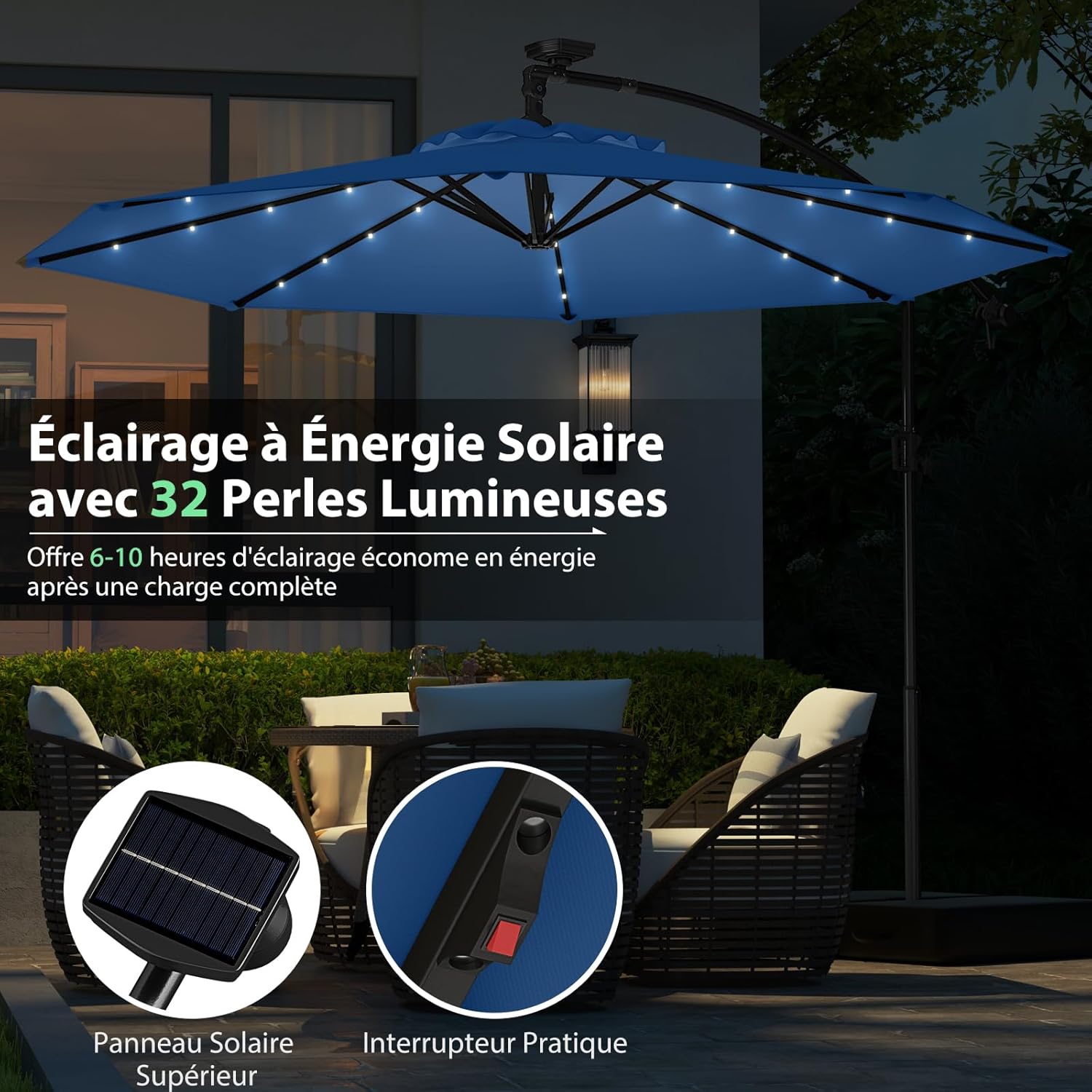 - 32 Lampes Solaires : Ce parasol d’extérieur dispose d’un total de 32 lumières LED intégrées qui éclaireront votre terrasse à la tombée de la nuit. De plus, toutes les lampes LED sont alimentées par des panneaux solaires situés au sommet afin d’économiser de l’énergie.