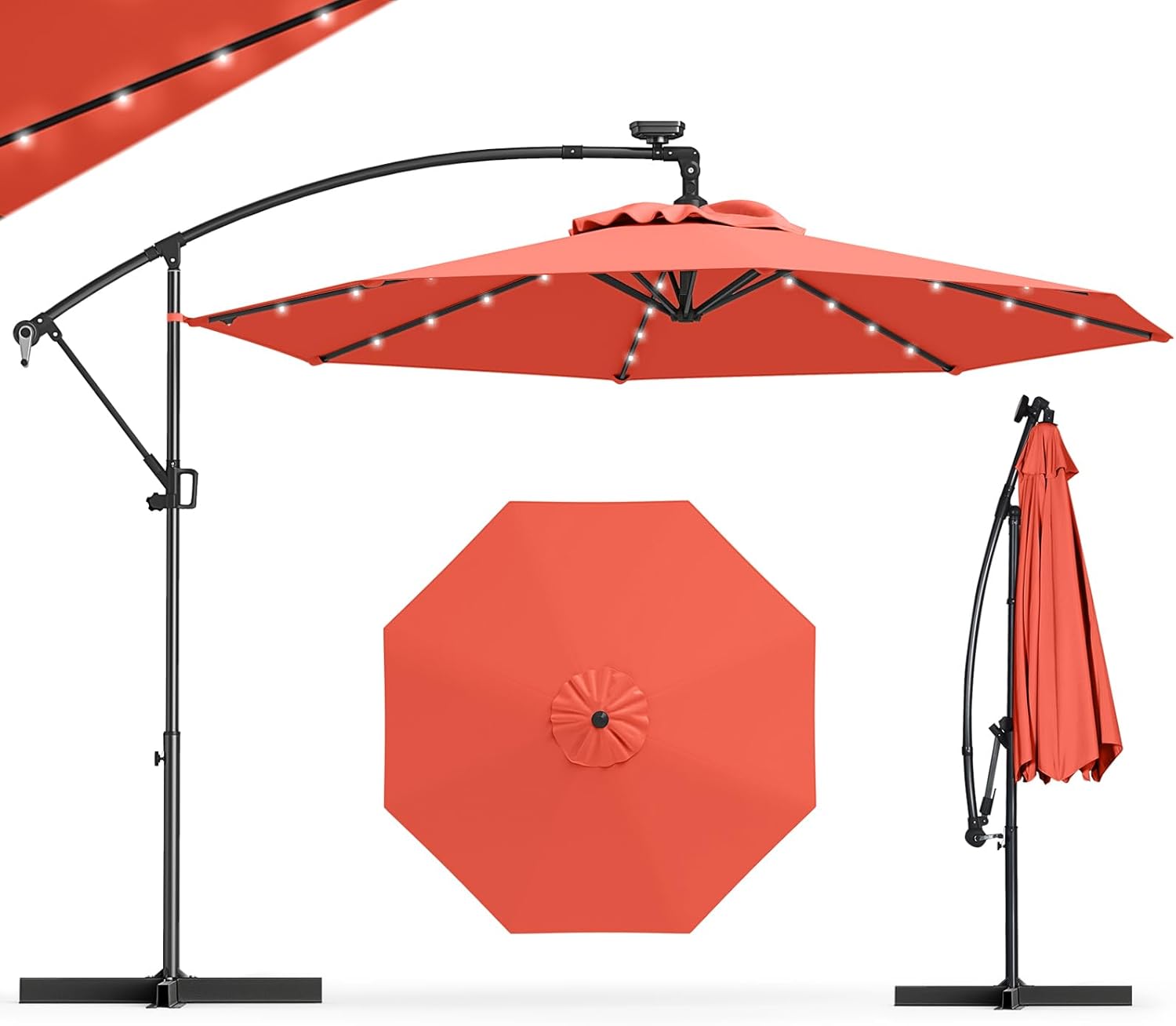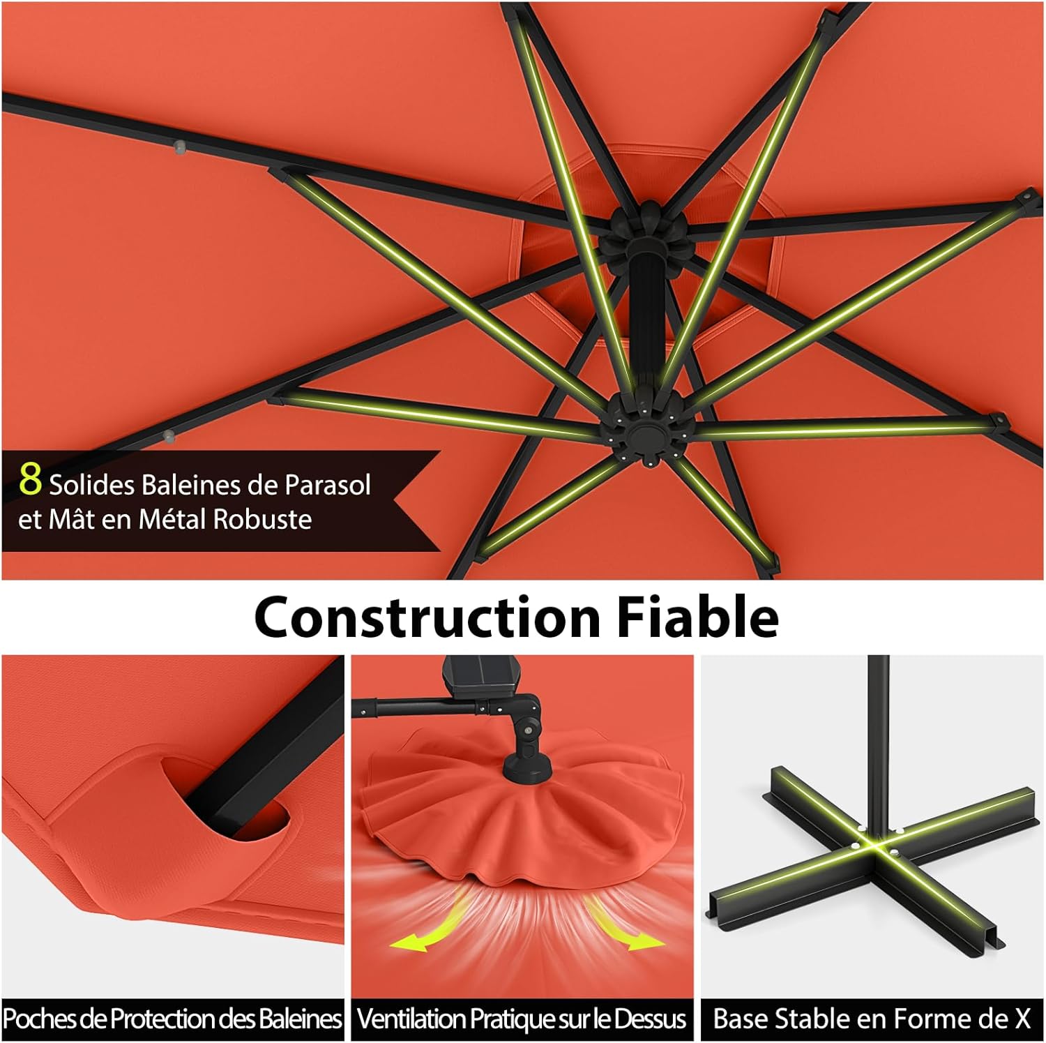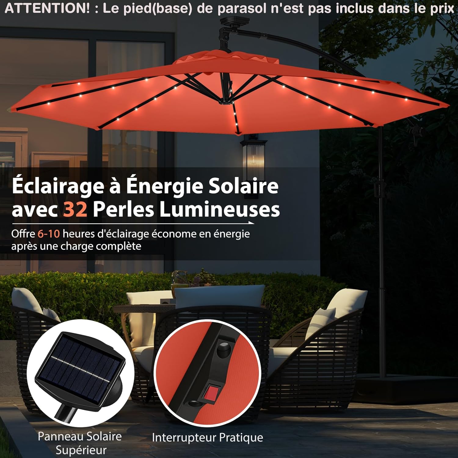 | Libellé | Parasol deporte avec 32 led solaires, parasol de jardin extérieur 8 baleines base non incluse orange |