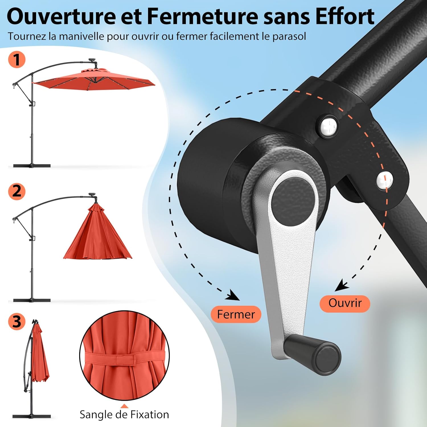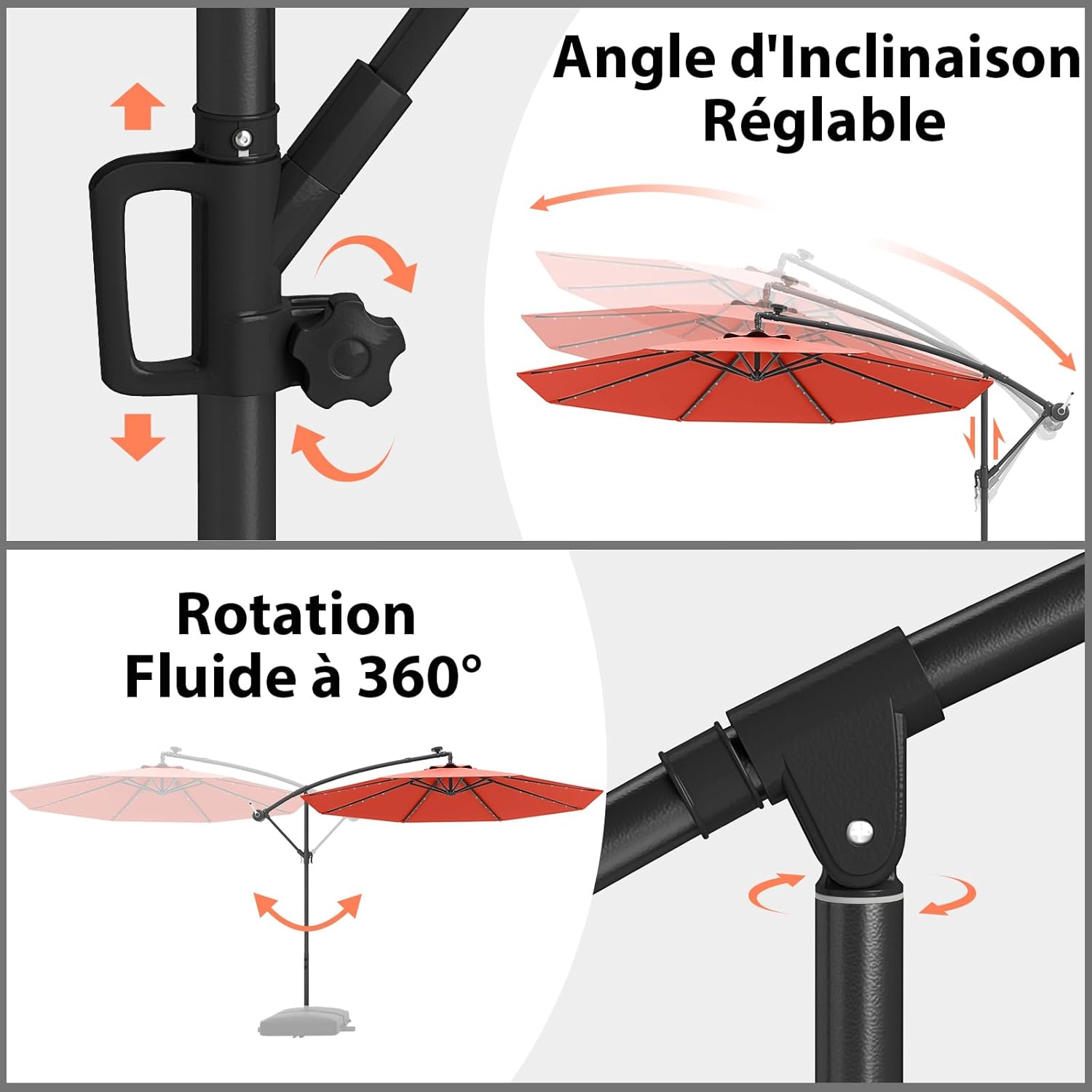 - Facile à Utiliser & Utilisation Multi-Sites : Il suffit d'ouvrir et de fermer le parasol de terrasse en quelques secondes en tournant le système de manivelle. Ce parasol déporté peut s’installer dans de nombreux endroits tels que le jardin, la terrasse, le patio, la piscine, la plage, le balcon, etc.