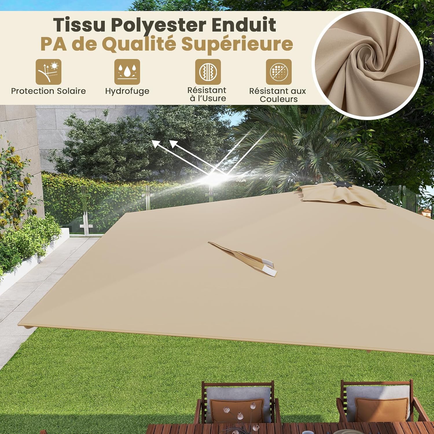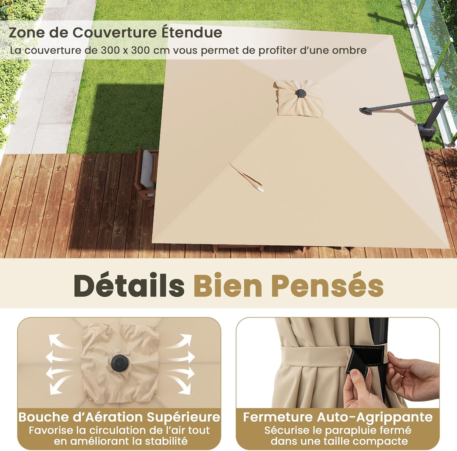 - Grande et Fraîche Zone d'Ombre : Le parasol extérieur offre une vaste zone ombragée de 3 x 3 m et sa partie supérieure est équipée d'une prise d'air pour favoriser la circulation de l'air et prévenir l'accumulation de chaleur. Vous pourrez ainsi profiter d'un après-midi agréable et frais avec votre famille ou vos amis sous le parasol.