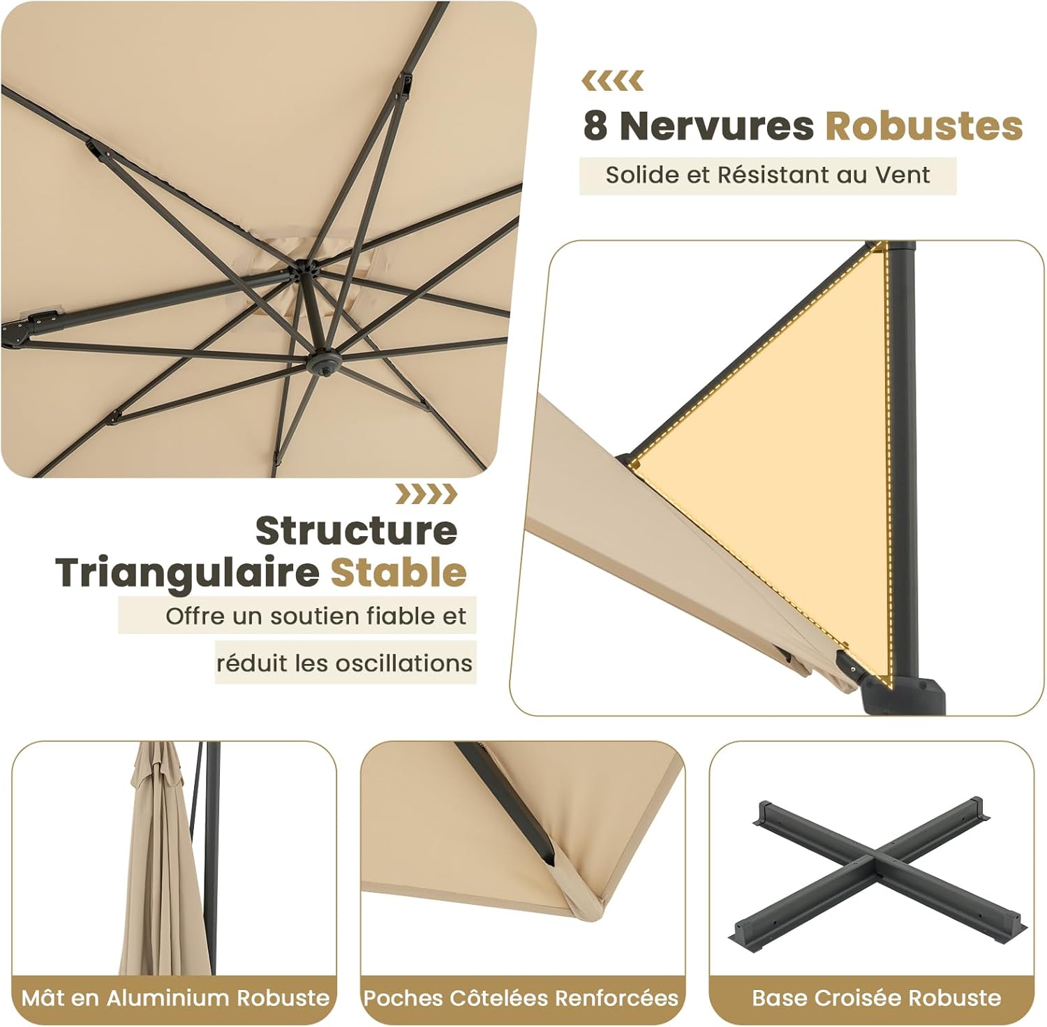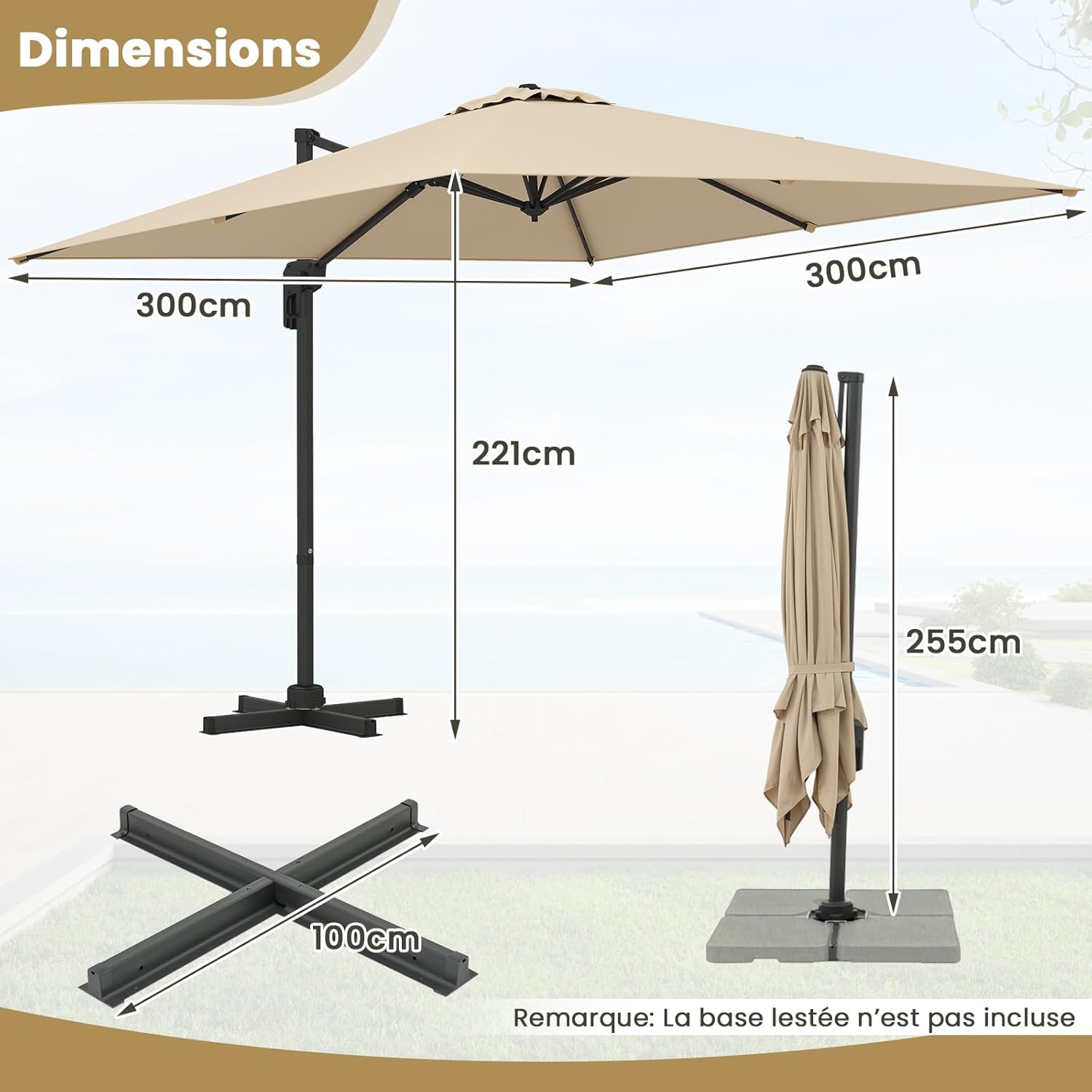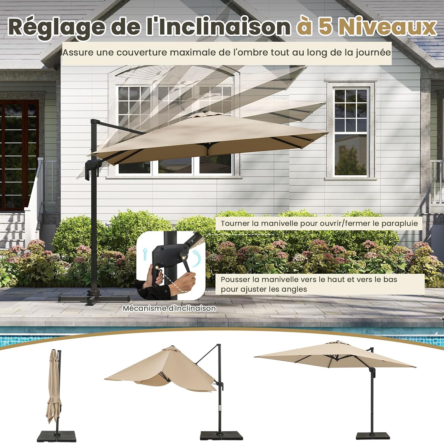| Libellé | Parasol déporté grand parasol de jardin exterieur pivotant à 360° avec 5 positions inclinables, beige |