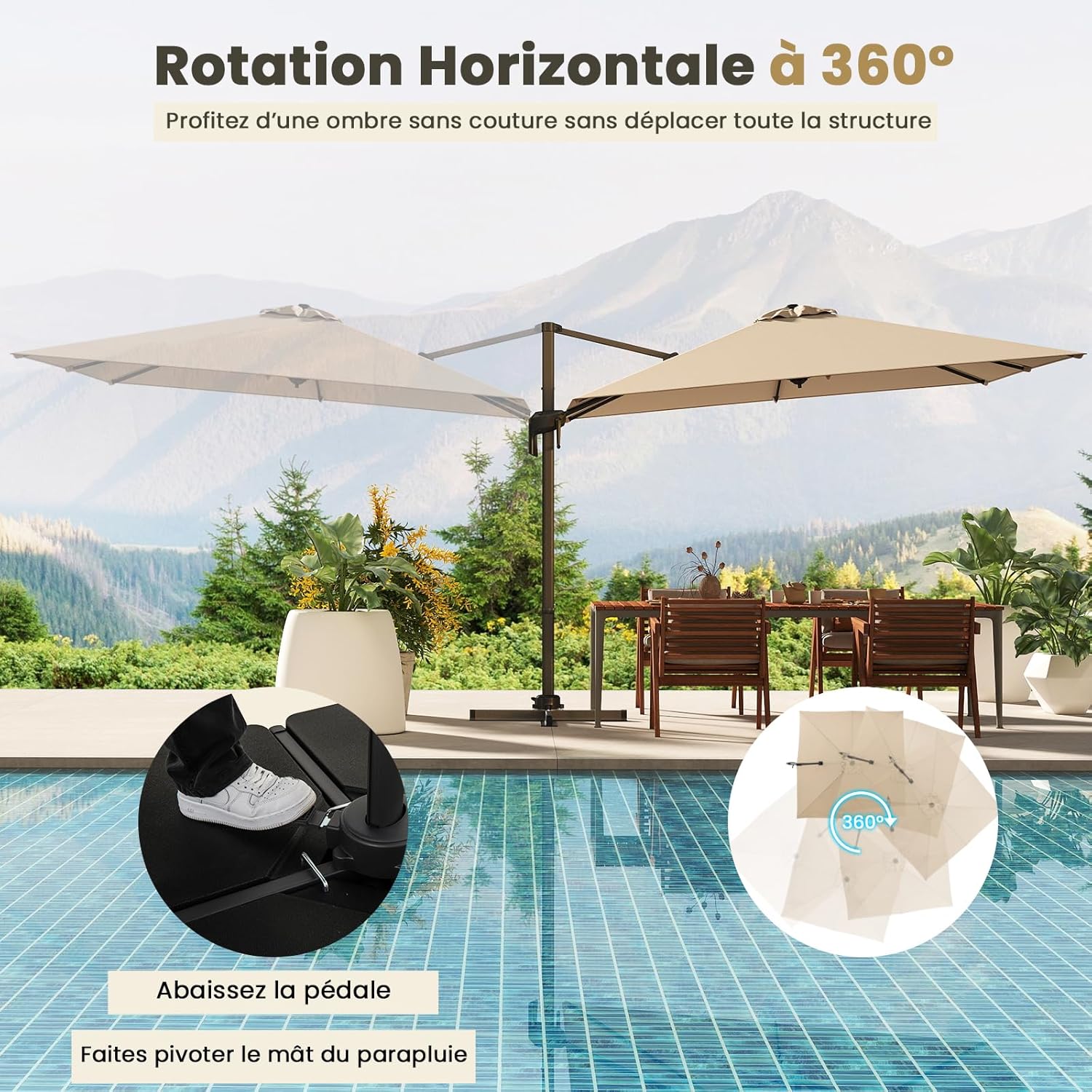 - Réglage Pratique : Grâce à l'angle d'inclinaison réglable en 5 positions et au pied pivotant à 360°, le parasol carré déporté vous protège du soleil et de la pluie venant de toutes les directions sans avoir à déplacer votre position. Le design facile à utiliser vous aide à trouver rapidement l'angle idéal pour vous détendre.