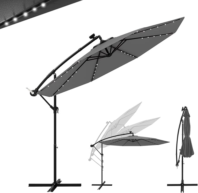 Parasol déporté lumière led, parasol de jardin extérieur 8 baleines avec base croisée parasol inclinable