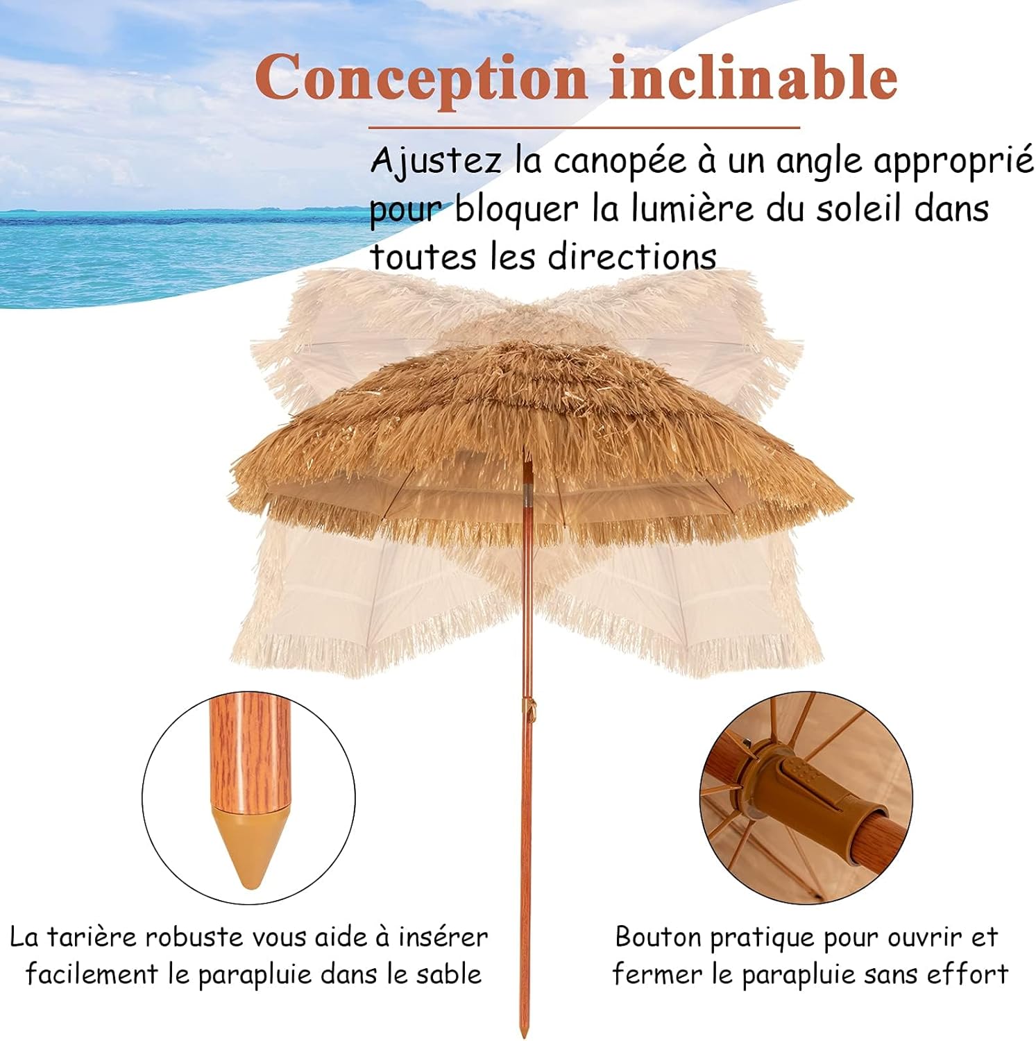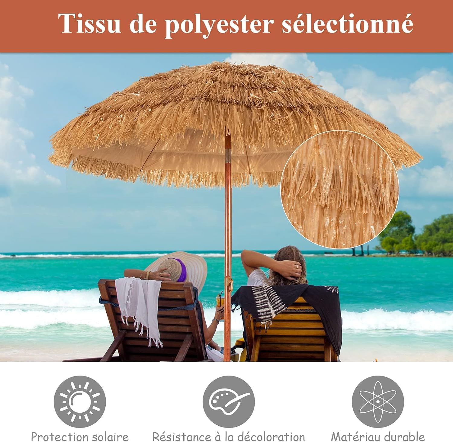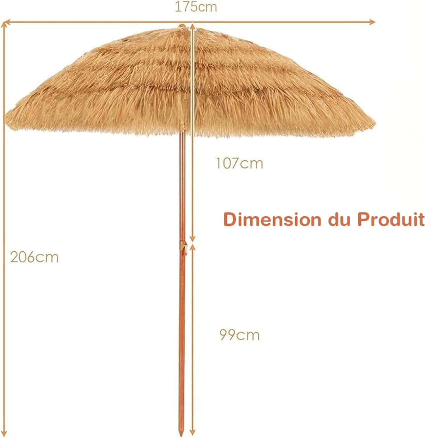 Voudriez-vous un parasol pour bloquer le soleil? Prenez notre parasol en paille en PP en considération! Ce parasol est léger, facile à ranger et à transporter. Fabriqué en PP, il est écologique et durable. Son style exotique attire plus d’attention et vous apporte la bonne humeur. La tige en fer augmente la stabilité et la solidité. Ce parasol de 2m est spécialement conçu pour la plage, la terrasse ou le jardin. Vous pouvez régler la position d'inclinaison à l'aide du bouton pour mieux bloquer la lumière du soleil et protéger la peau des dommages. Achetez-le si vous adorez!