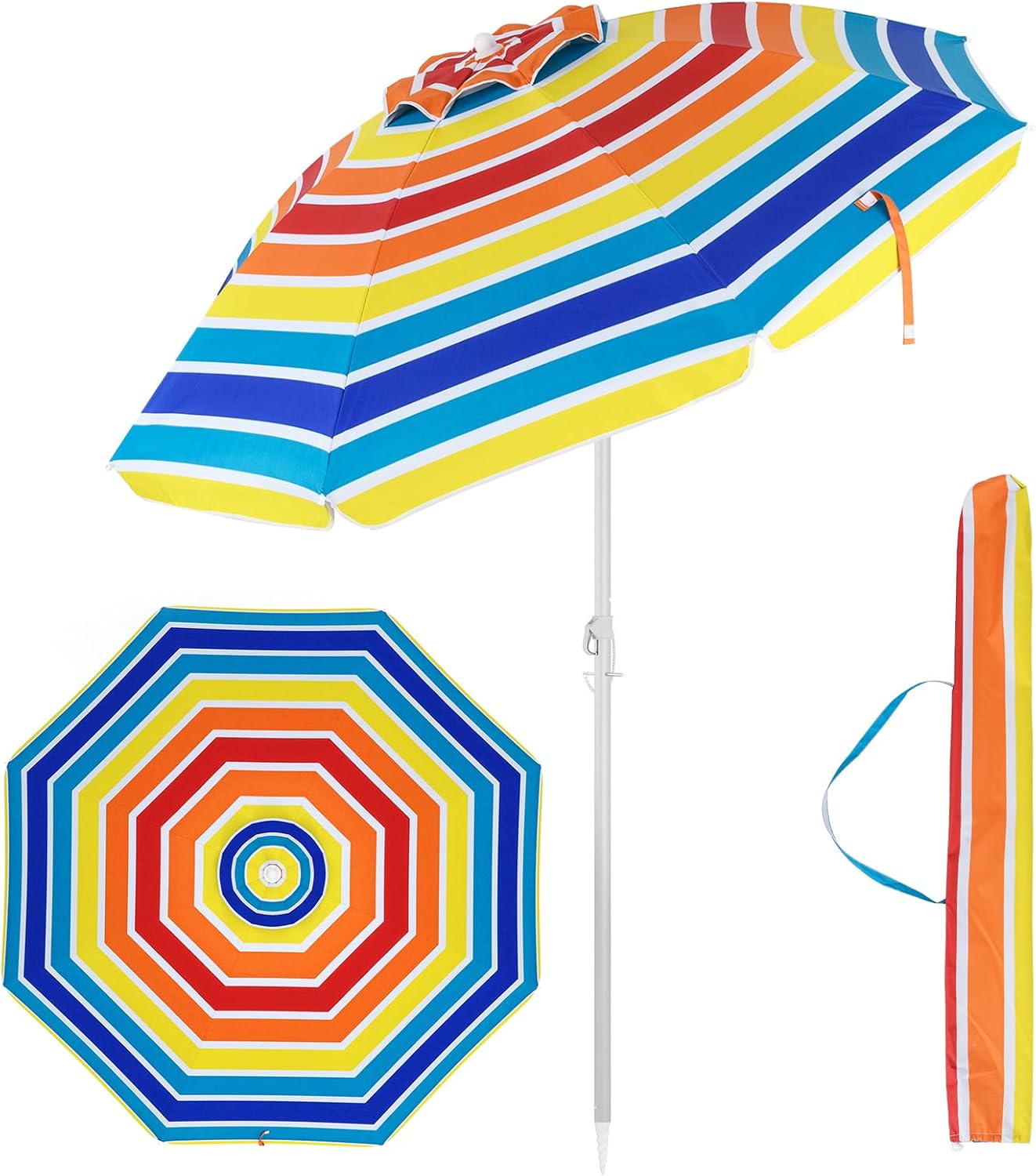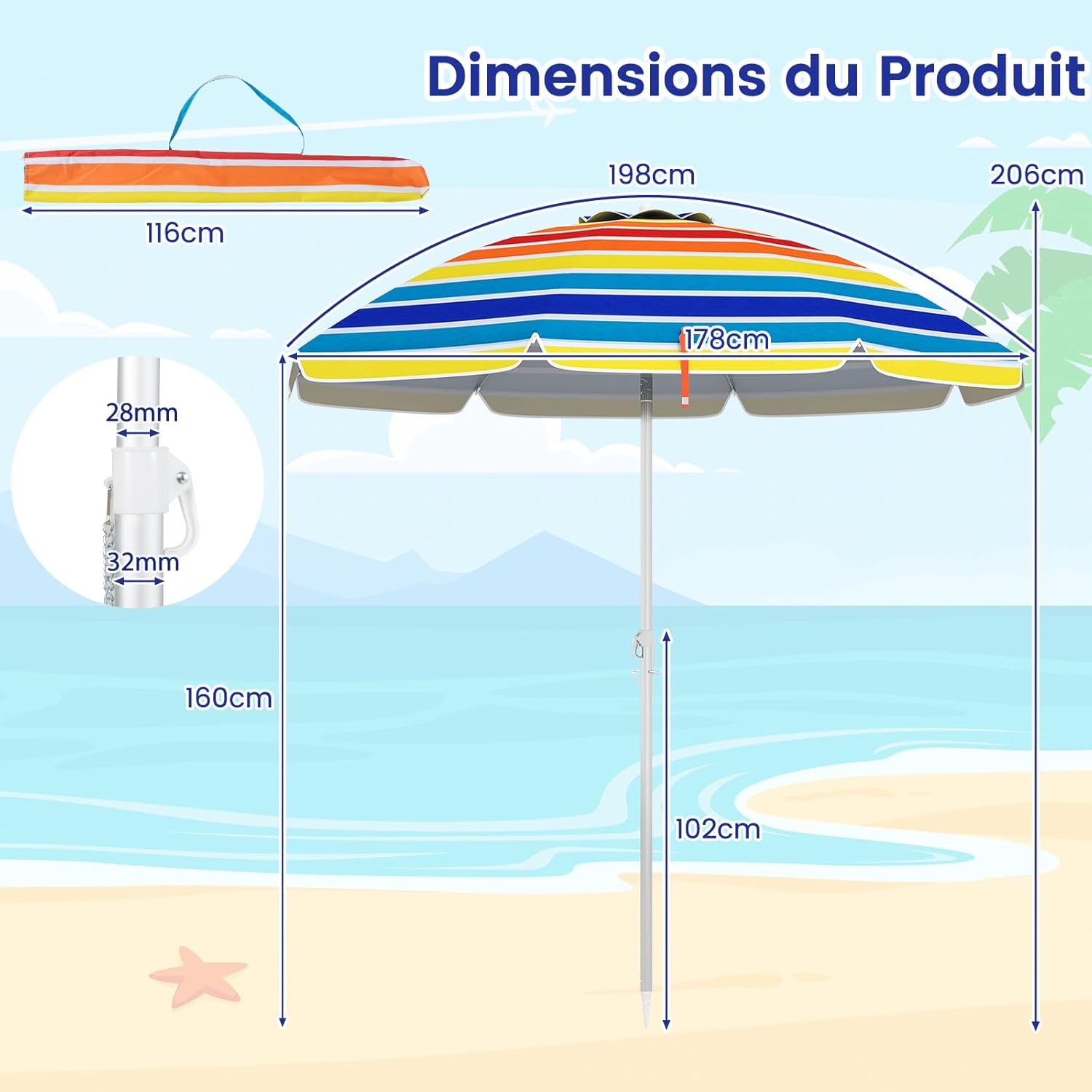Profitez des journées ensoleillées au frais sous l’ombre du parasol de plage et ses rayures multicolores. Notre parasol de plage à une protection solaire UV50. Protégez votre peau et celle de ceux que vous aimez avec ce parasol de plage ou de piscine .Sa structure en aluminium la rend légère et résistante à la fois.Il peut être démonté et rangé rapidement, vous pouvez mettre le parasol dans le sac de transport et l'emmener n'importe où sans fardeau.