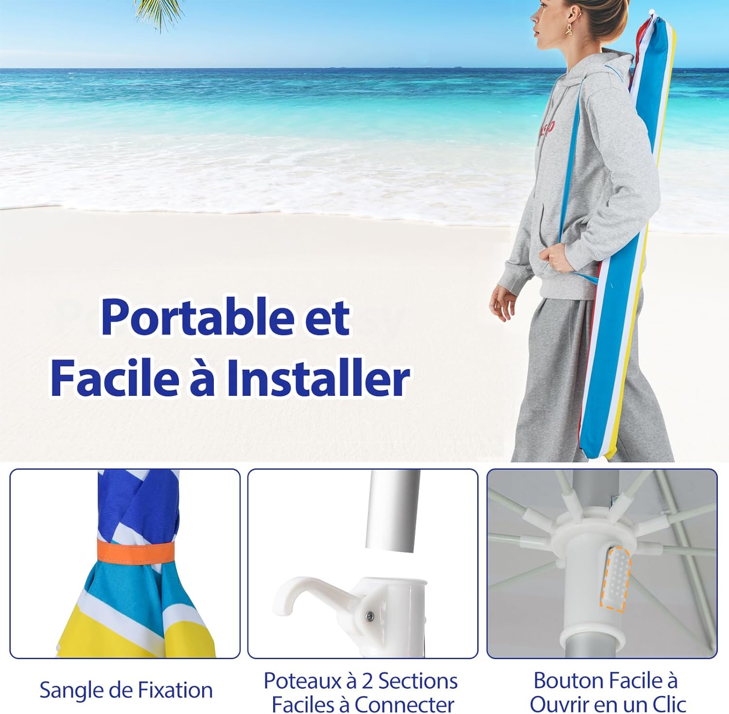 - Parasol de plage réglable : Le réglage facile de l'inclinaison par bouton-poussoir lui permet de suivre le soleil et de maximiser votre ombre à tout moment de la journée. Conception toit coupe-vent qui favorise la circulation de l'air.