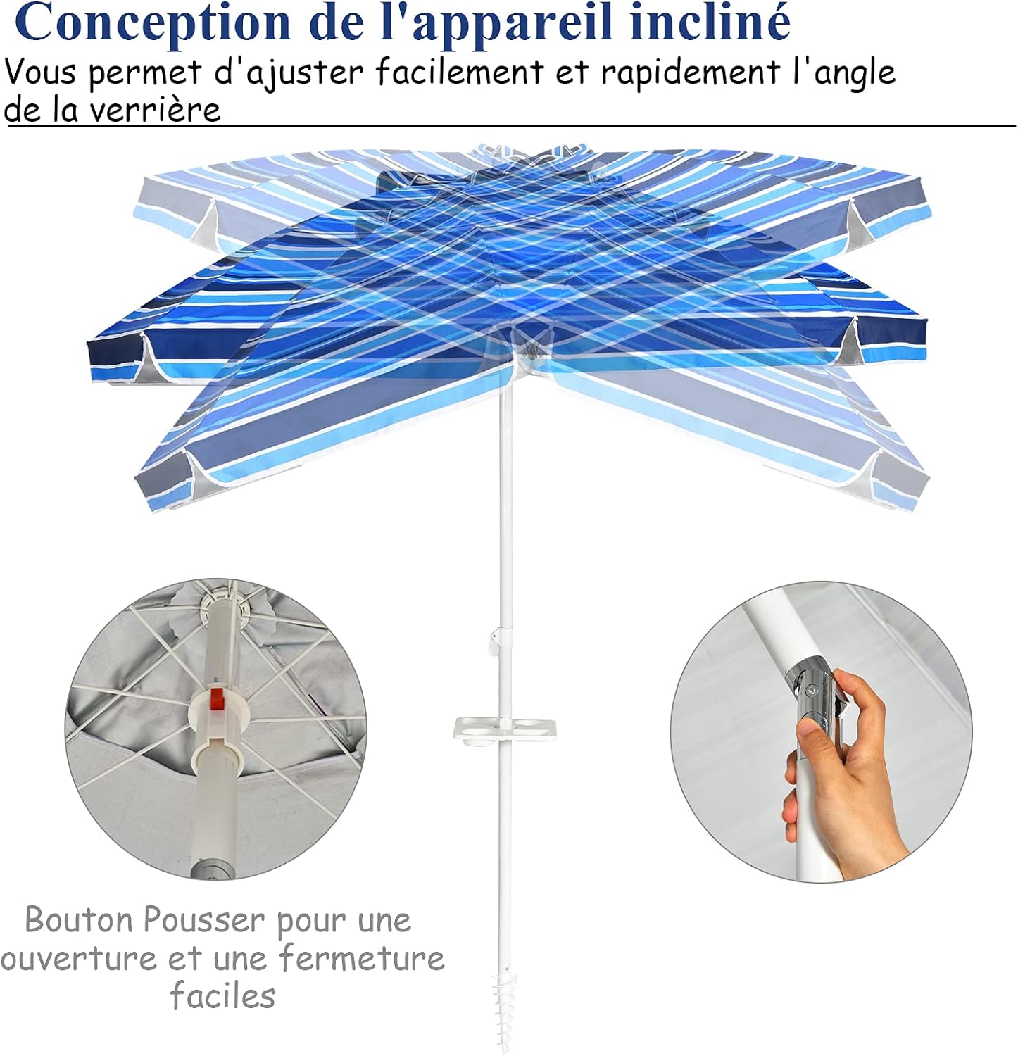 - Conception humanisé avec porte-boisson : Ce parasol de plage est équipé d'un porte-gobelet. Vous pouvez y mettre les boissons et les collations. La conception du puits de lumière permet une bonne ventilation et vous offre un environnement de repos confortable. Grâce à un bouton rouge, vous pouvez facilement ouvrir et fermer le parasol.