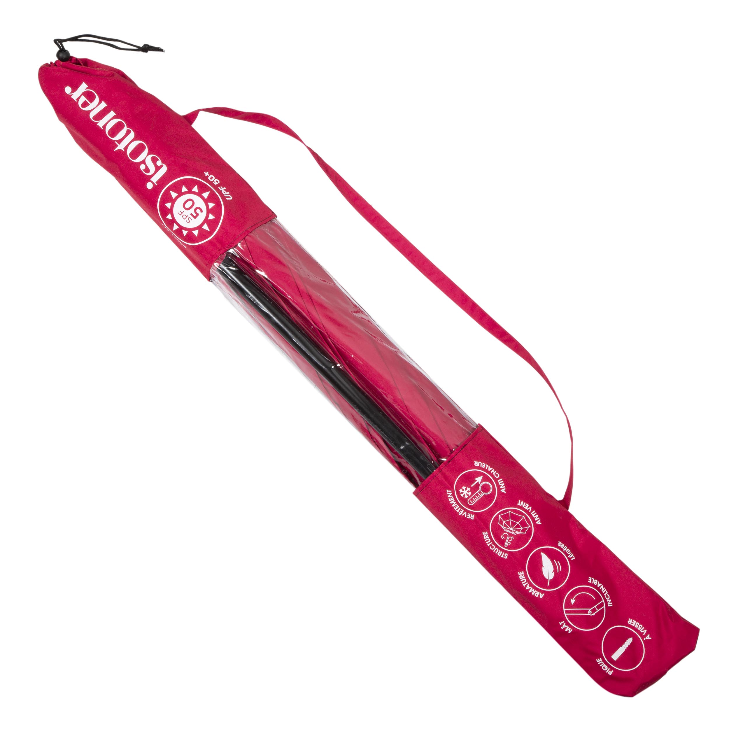 Le parasol de plage Isotoner allie innovation et protection solaire optimale. Son revêtement vert ANTI UV UPF50+ bloque au moins 95 % des rayons UV et rafraîchit l’ombre de -2 à -3 °C. L’armature en aluminium et fibre de verre garantit résistance au vent et légèreté, tandis que le sommet ajouré améliore la tenue et la circulation de l’air. Le mât réglable de 135 à 180 cm et inclinable à 360° se fixe facilement dans le sable ou la terre grâce à son pied pique à visser. Sa large toile protège efficacement, et son poids léger (1,38 kg) permet un transport facile : plié, il mesure 115 cm et se range dans sa housse avec bandoulière. Dimensions : 180 cm en arc, 160 cm de diamètre. Conseil : lunettes, chapeau, crème solaire et hydratation restent nécessaires même sous le parasol, notamment face aux réverbérations du sable et de l’eau.
