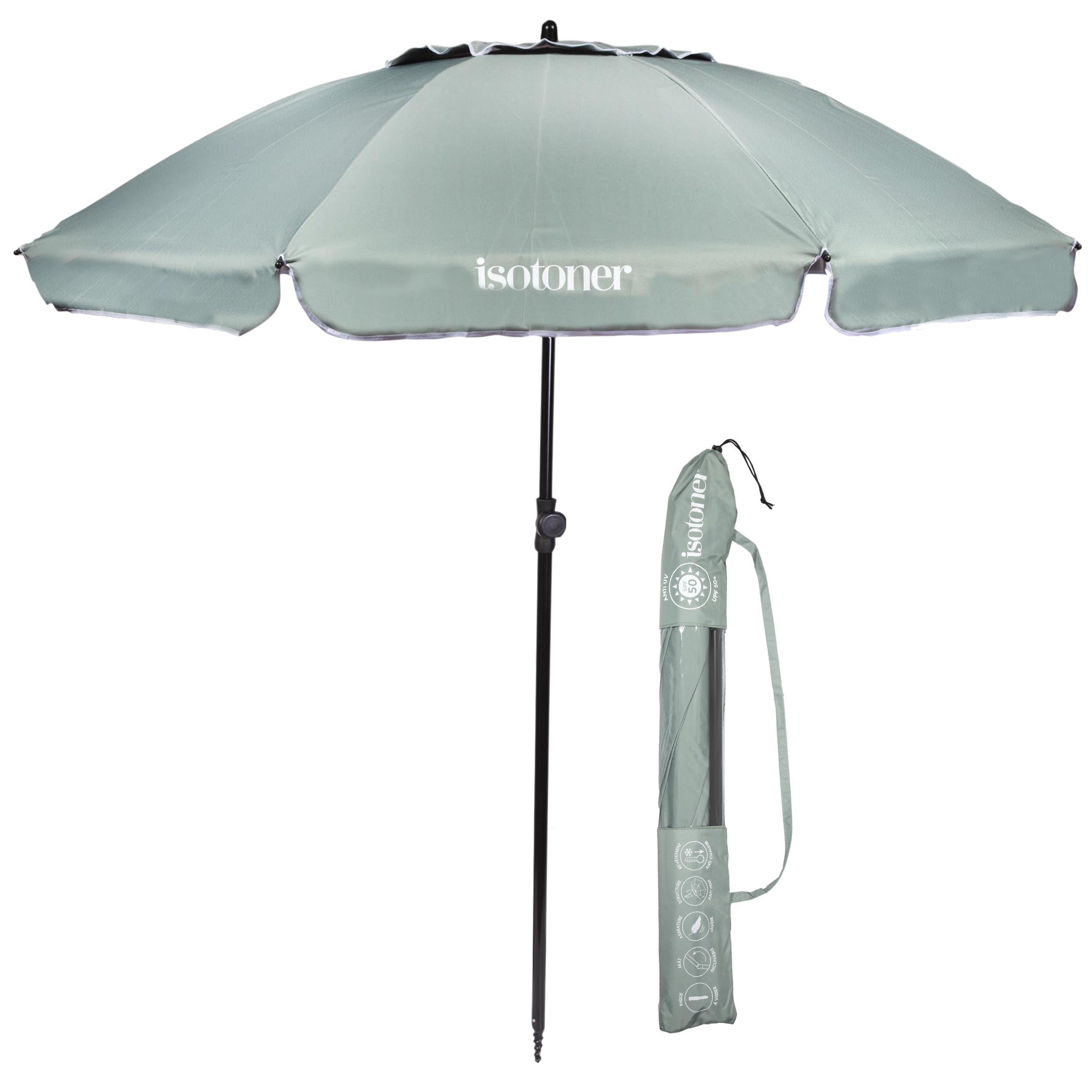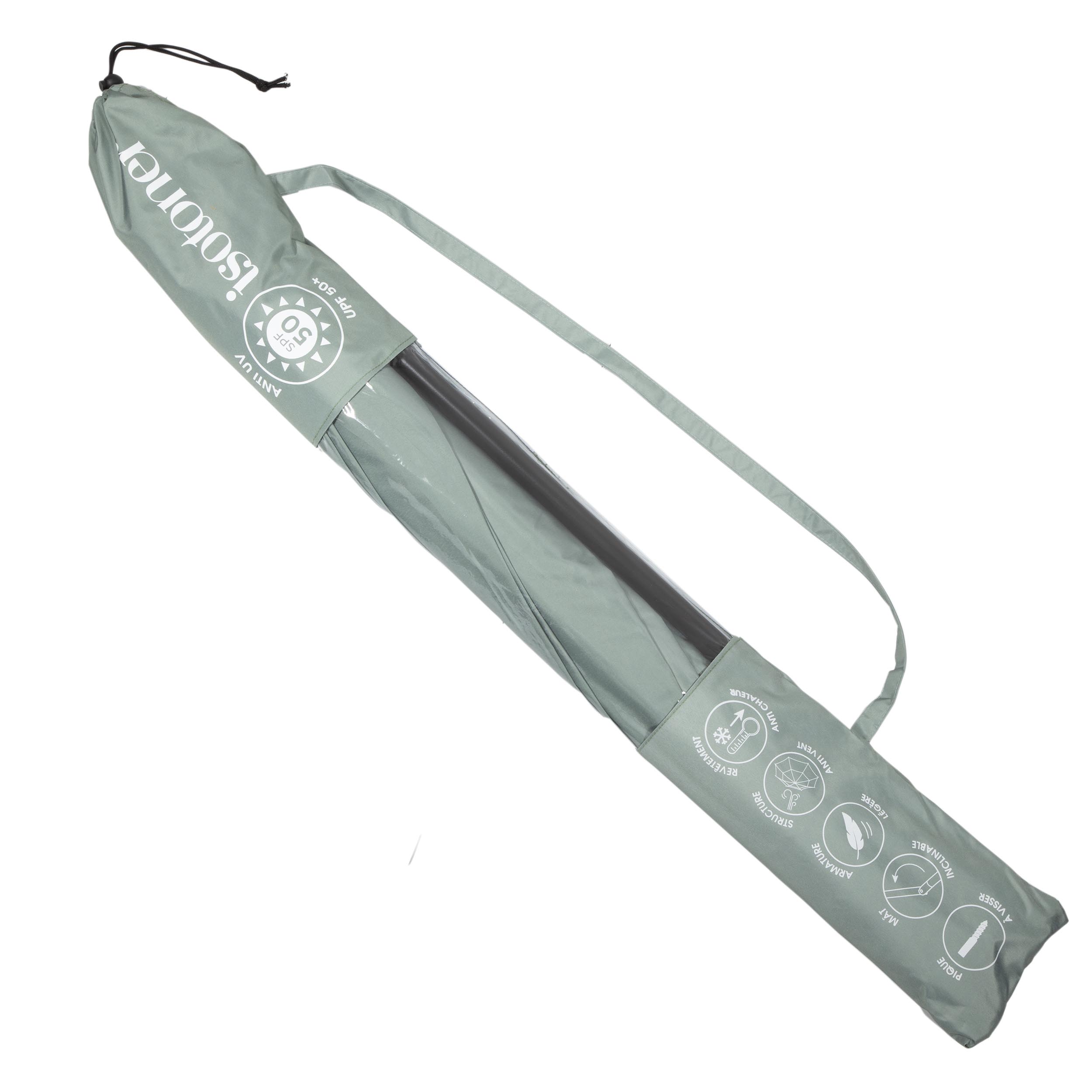 Le parasol de plage Isotoner est innovant et offre une excellente protection solaire grâce à son revêtement vert ANTI UV UPF50+ qui bloque au minimum 95% des rayons UV et rafraichit l'ombre sous le parasol de -2 à -3 degrés. L'armature du parasol en aluminium et fibre de verre garantit à la fois résistance aux vents forts mais aussi légèreté. La partie supérieure est ajourée pour améliorer la tenue au vent et permettre une meilleure circulation de l'air sous la toile du parasol.Le mât du parasol peut être réglé de 135 à 180 cm et est inclinable avec orientation à 360°. Le parasol se fixe facilement dans le sable ou la terre grâce au bout de pied en forme de pique à visser. Avec sa toile de large envergure, il reste toute fois très léger avec un poids de 1,38kg, mais aussi très transportable ! En effet, une fois plié, il suffit de le glisser dans sa housse assortie d'une bandoulière et le voilà qui ne fait plus que 115 cm de long. Dimensions : 180 cm en arc et 160 cm de diamètre. Comportements face au soleil La haute protection UV de ce parasol est certifiée « testé et approuvé » néanmoins cela n’empêche pas les phénomènes de réverbération (sur l'eau, le sable...). Face au soleil, Il est recommandé de suivre les comportements adaptés tels que : port de lunettes de soleil, d'un chapeau, de vêtement UV, application régulière d'une crème solaire adaptée, et de s’hydrater régulièrement en prenant en compte chaleur et heure d’exposition.