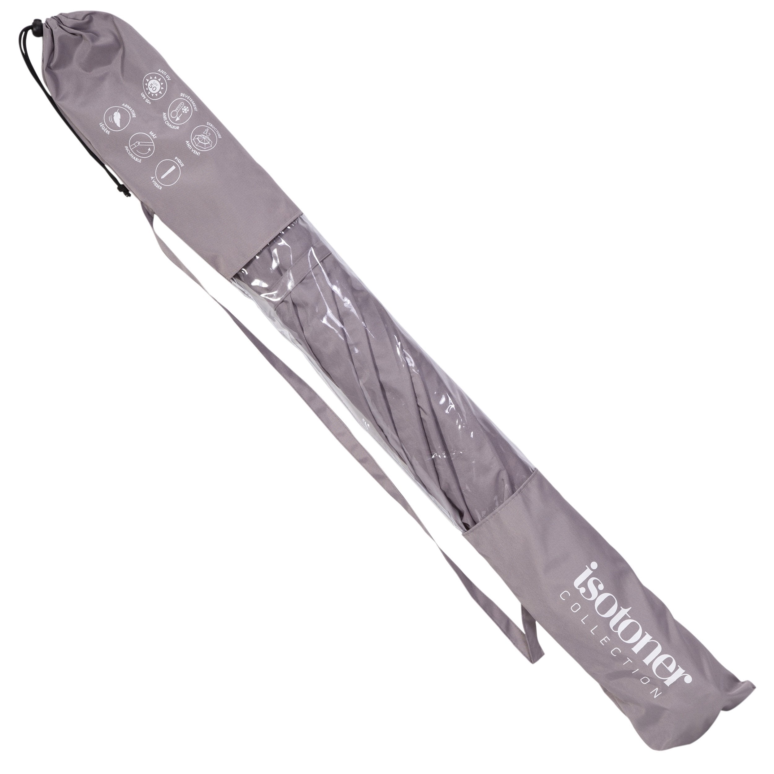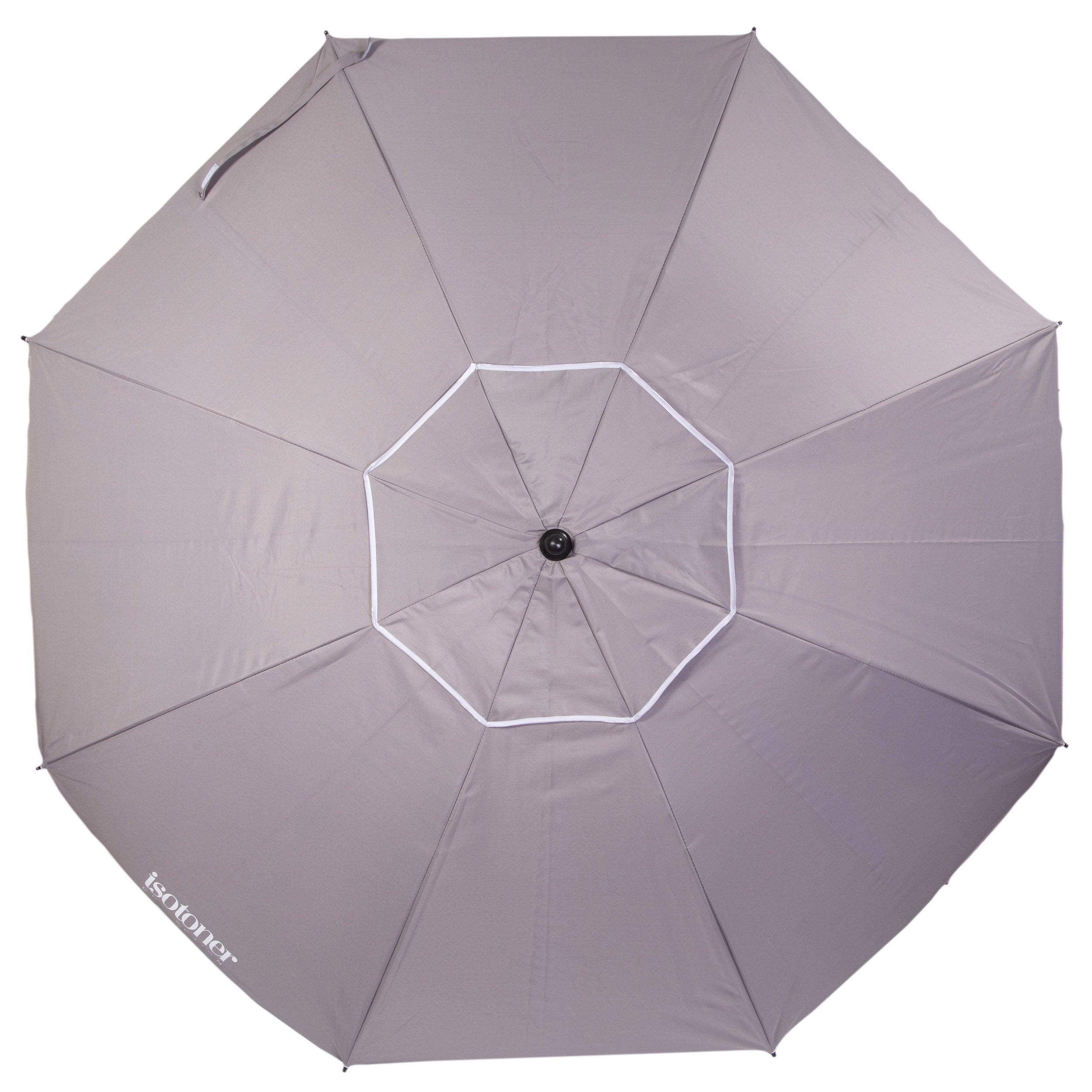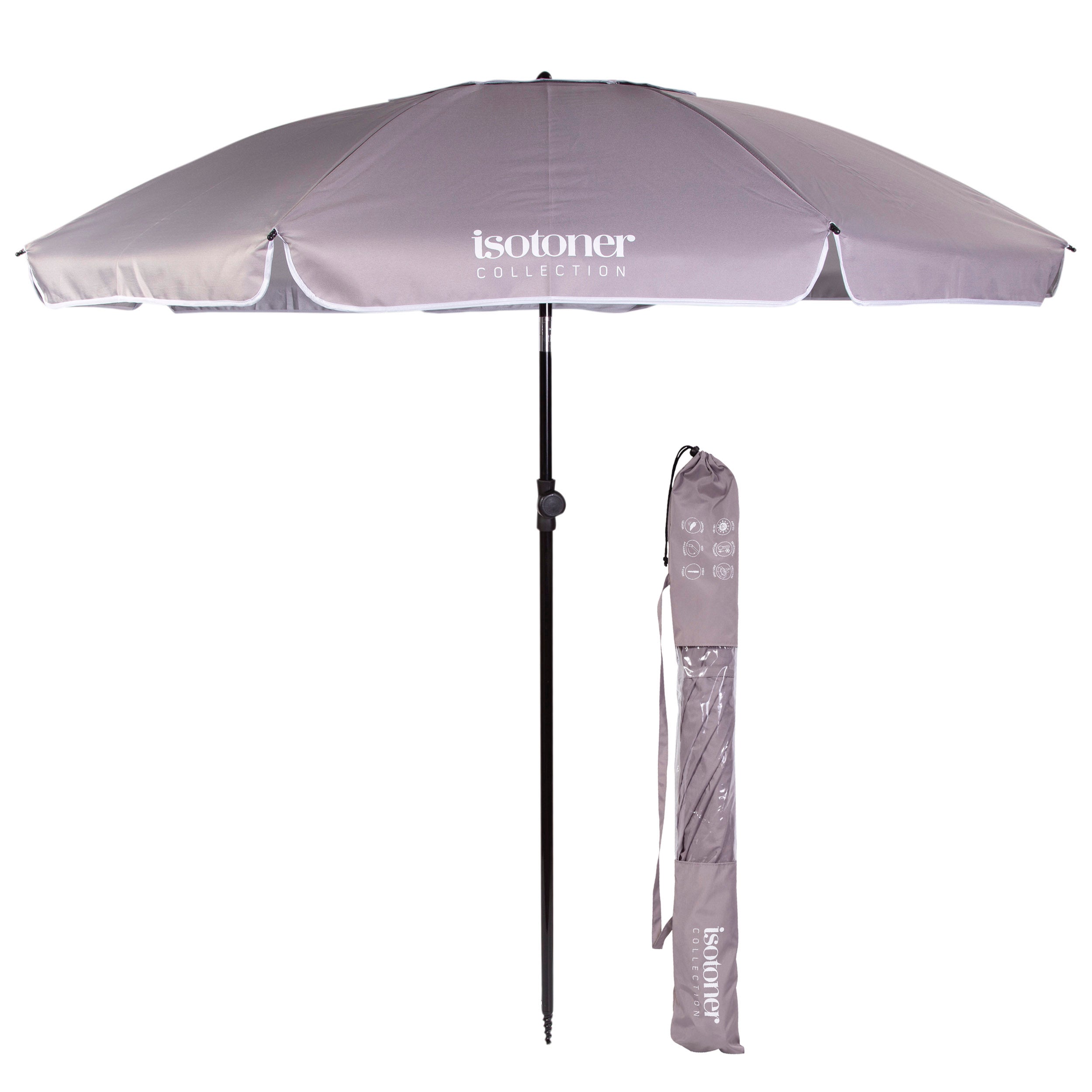 Le parasol de plage Isotoner allie innovation et protection solaire optimale. Son revêtement vert ANTI UV UPF50+ bloque au moins 95 % des rayons UV et rafraîchit l’ombre de -2 à -3 °C. L’armature en aluminium et fibre de verre garantit résistance au vent et légèreté, tandis que le sommet ajouré améliore la tenue et la circulation de l’air. Le mât réglable de 135 à 180 cm et inclinable à 360° se fixe facilement dans le sable ou la terre grâce à son pied pique à visser. Sa large toile protège efficacement, et son poids léger (1,38 kg) permet un transport facile : plié, il mesure 115 cm et se range dans sa housse avec bandoulière. Dimensions : 180 cm en arc, 160 cm de diamètre. Conseil : lunettes, chapeau, crème solaire et hydratation restent nécessaires même sous le parasol, notamment face aux réverbérations du sable et de l’eau.