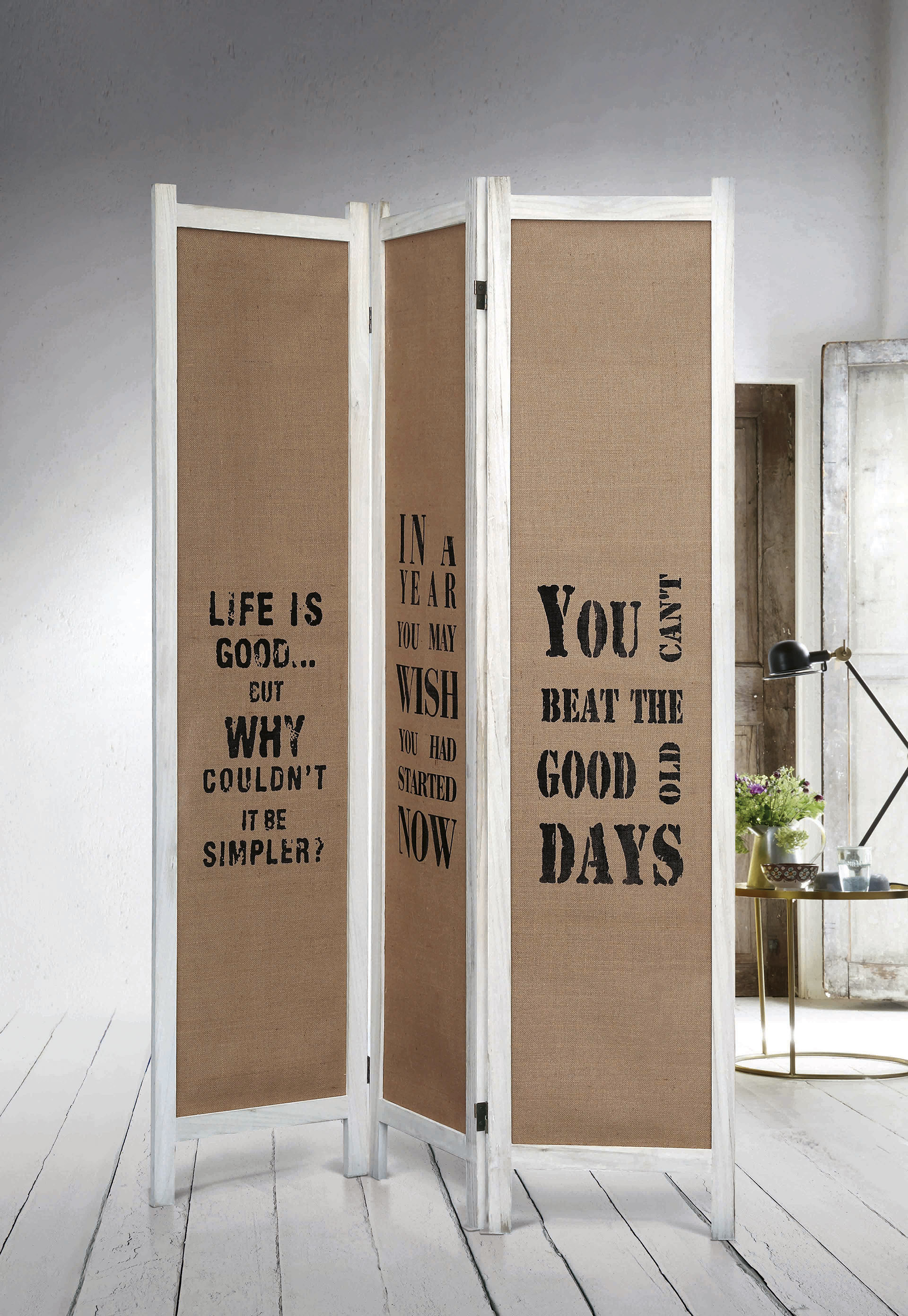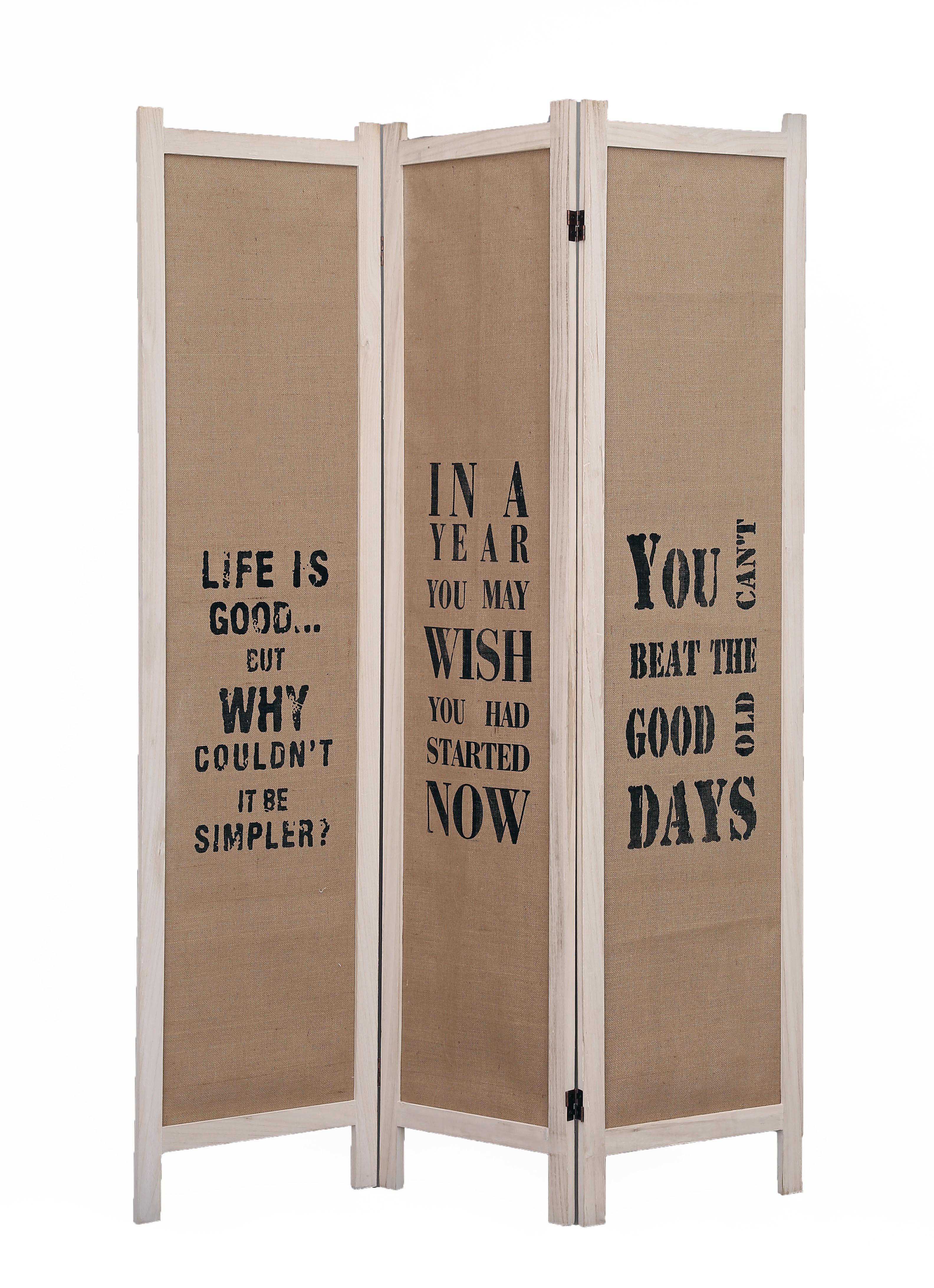 Le style Vintage de ce paravent est la caractéristique principale qui donnera personnalité à vos pièces à vivre et il est idéal pour effectuer une séparation dans l'office, un restaurant ou la maison. La structure est fabriquée en bois de pin cérusée en couleur blanc avec de toile de jute dans l'intérieur qui a des lettres imprimées et les charnières permettent de roter les panneaux 360º.