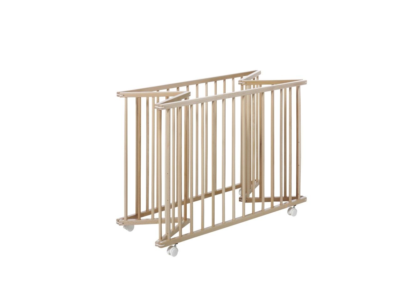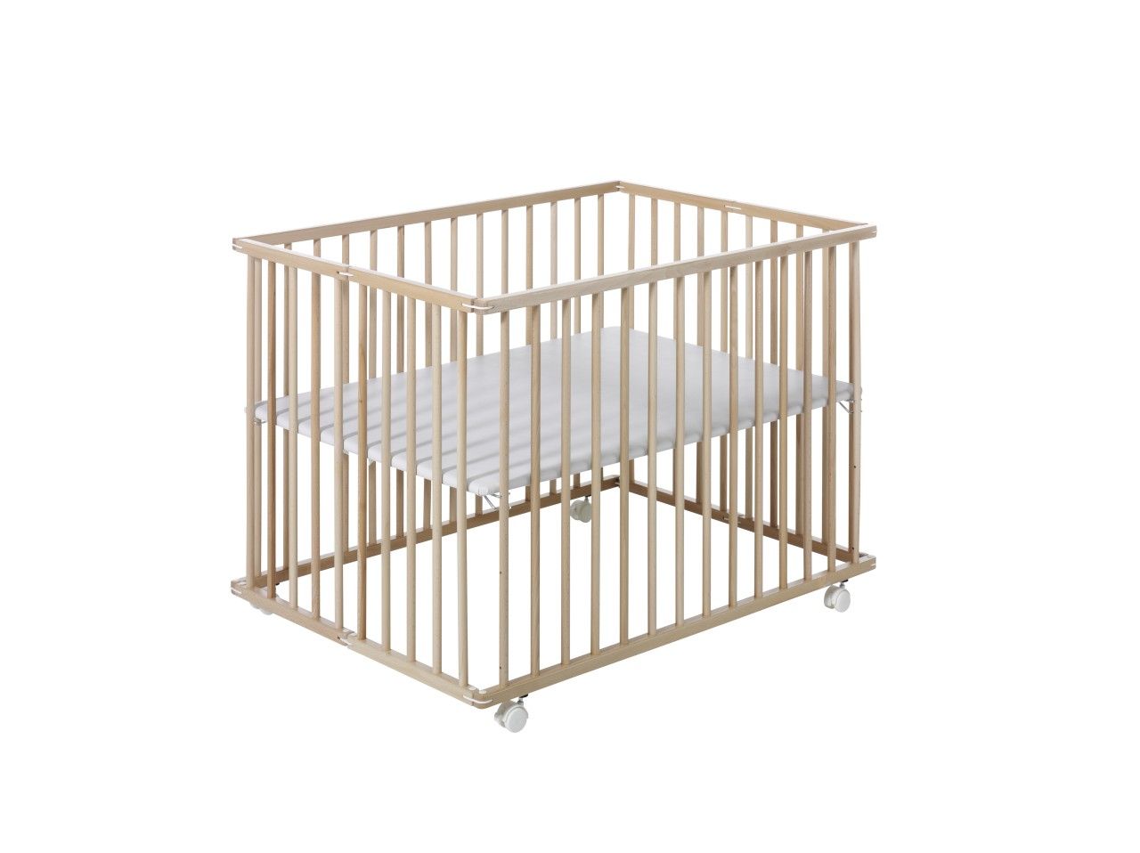 Parc pliable BamBinou de Geuther Dimensions déplié : largeur 75 cm, longueur 103 cm, hauteur 73 cm Dimensions plié (sans fond) : 9,5 x 103 x 73 cm Fond rembourré : 71 x 99 cm Fond réglable en 3 hauteurs Sécurité : conforme à la norme EN 12227 Composition : 100% en hêtre massif Fond en panneau de fibres agglomérées 4 roulettes Revêtement PVC