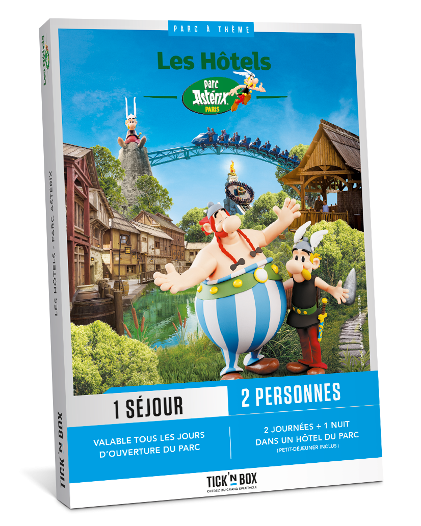 Avec Tickn'Box, découvrez le Parc Astérix. Quand ils ne sont pas en train de repousser l’envahisseur, les Gaulois ont de quoi s’amuser : 47 attractions et spectacles, plus fous les uns que les autres… Il y en a pour tous les goûts, et tous les âges ! Avec Tickn'Box, plongez dans l'univers des plus beaux parcs à thèmes d'Europe Dans votre Tickn'Box, vous découvrirez : Un chèque cadeau échangeable contre 2 entrées pour 2 journées au parc Une nuit pour 2 personnes dans l'un des 3 hotels du parc Astérix (en fonction de la date réservée) 2 petits-déjeuners Ce chèque permet de réserver votre séjour en vous connectant sur le site tickandbox.net. Le coffret est valable pour 2 personnes, 24 mois à compter de sa date d’achat. Tickn'Box est revendeur officiel du Parc Astérix. Choisissez votre séjour et vivez une expérience unique. Votre séjour est totalement personnalisable lors de votre réservation en ligne (ajout d'entrées, de journées ou de nuitées supplémentaires au meilleur prix du moment)