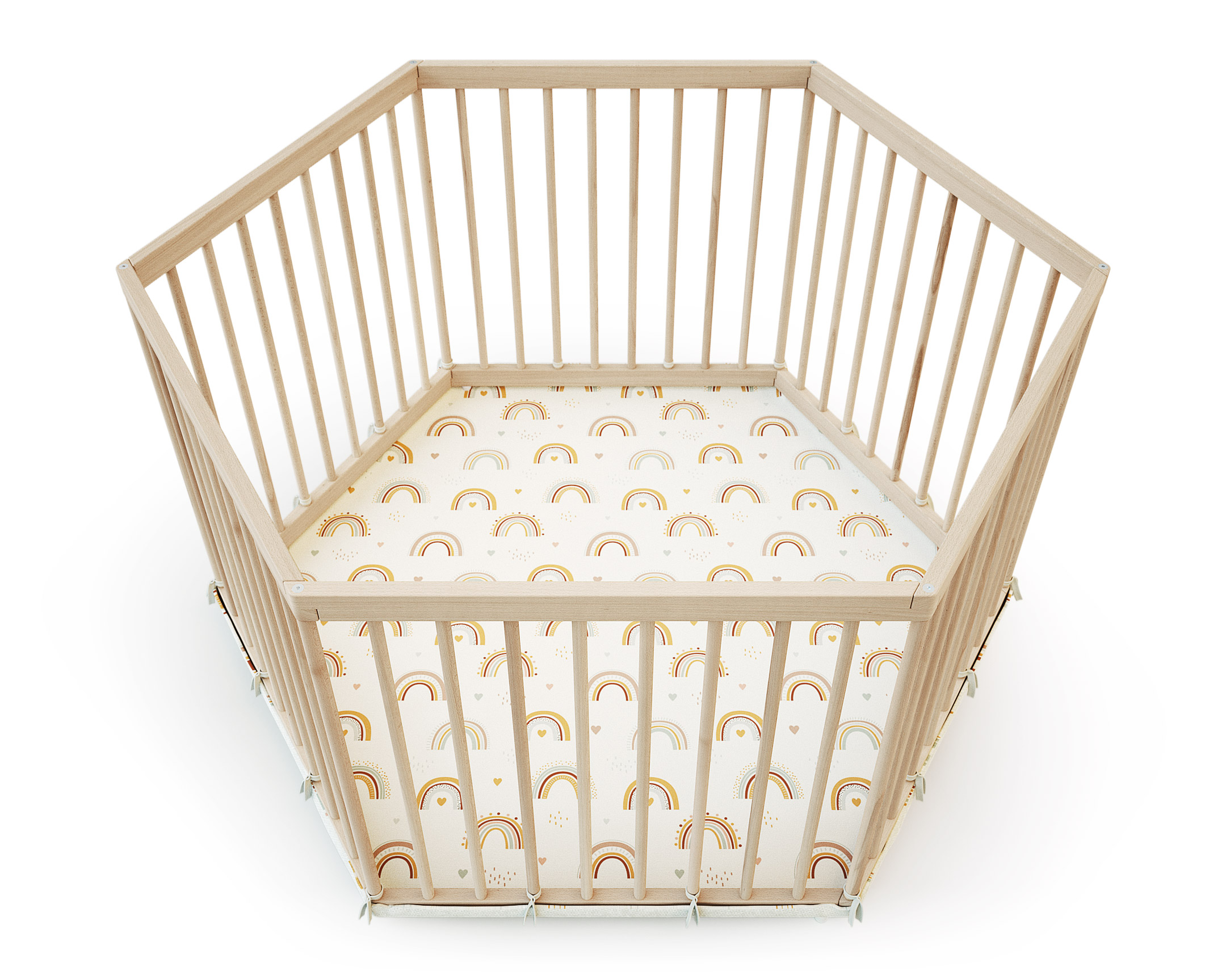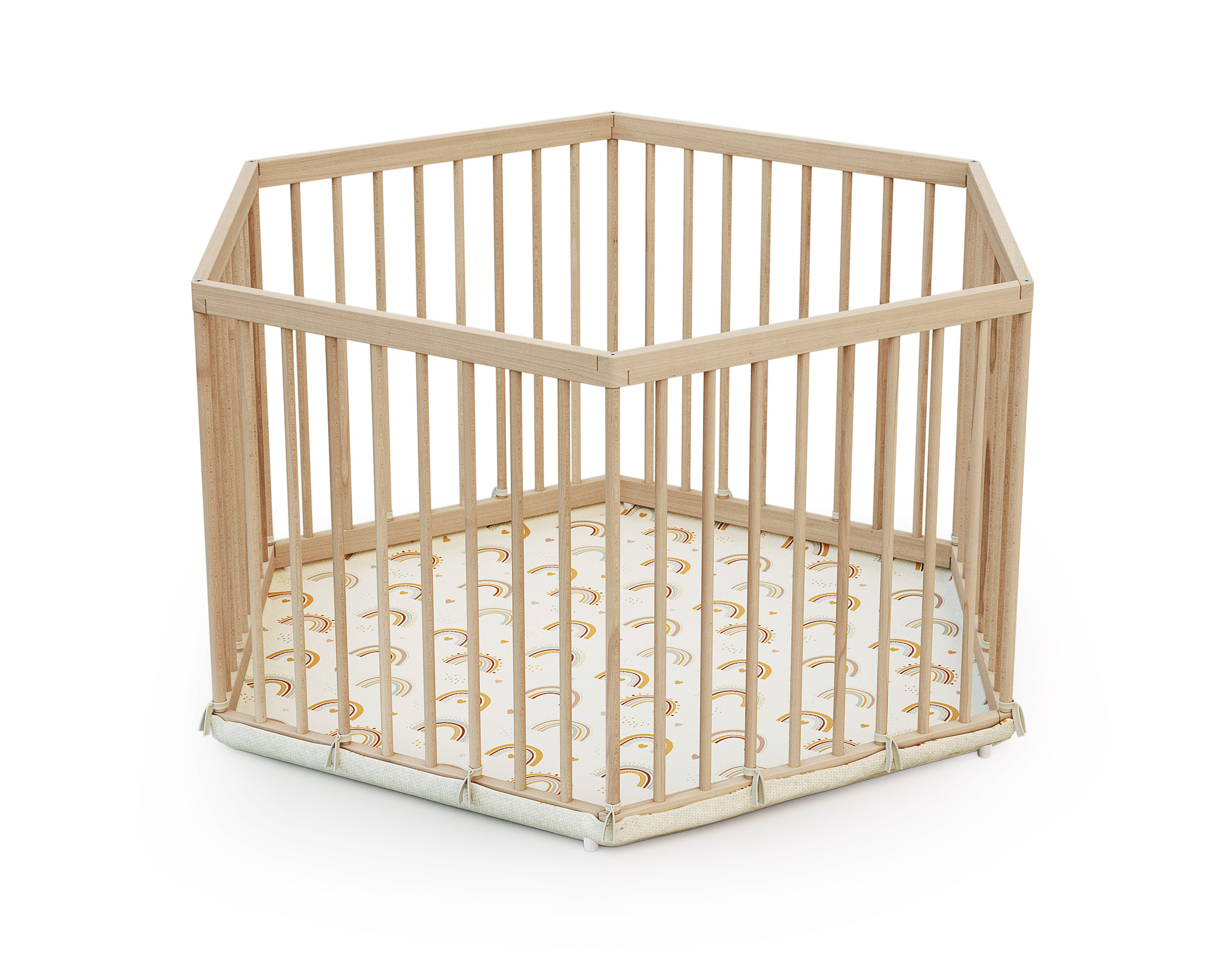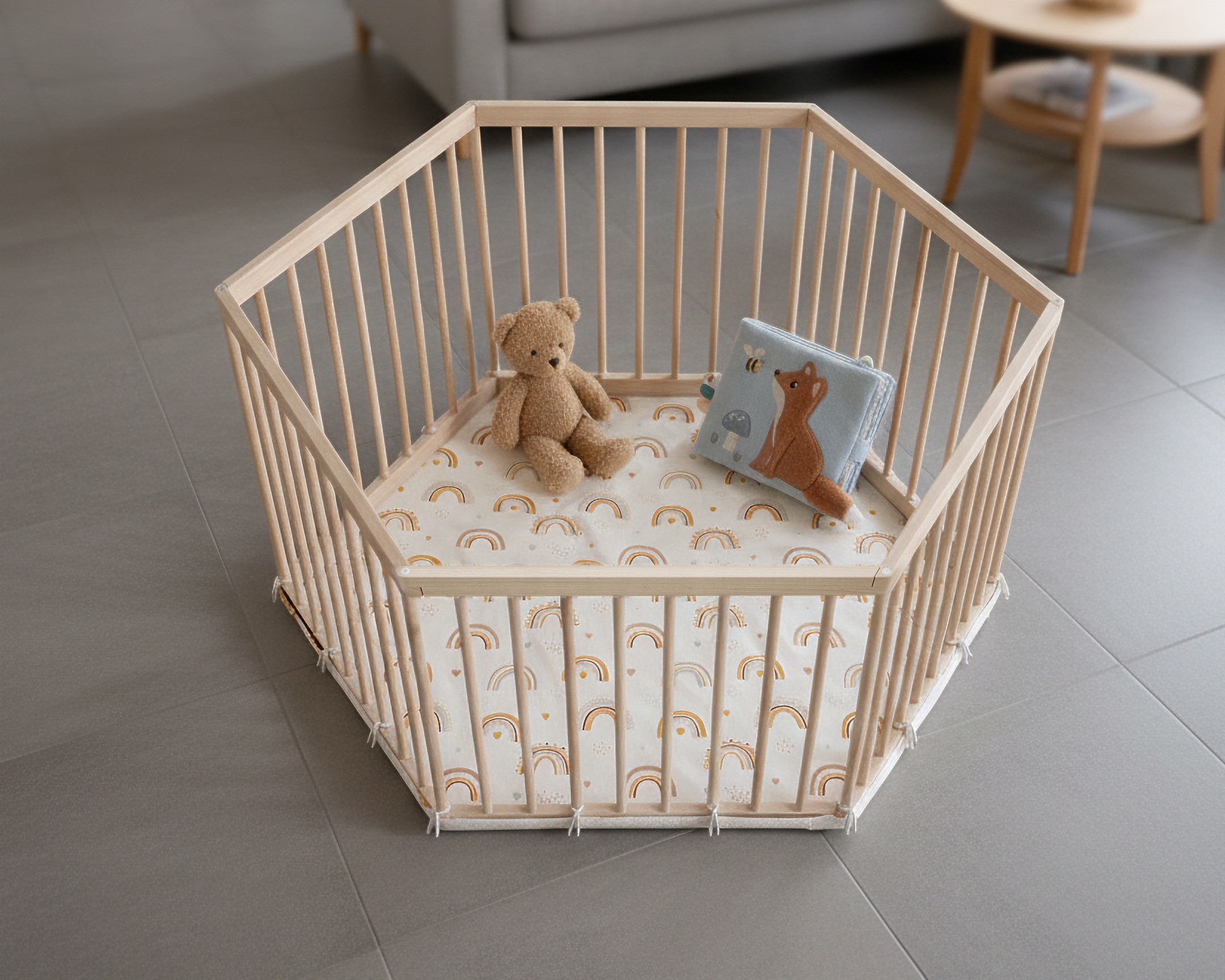 De forme hexagonale, ce parc en bois pour bébé 125 x 109 x 65 cm offre un bel espace pour jouer et grandir en toute sécurité.