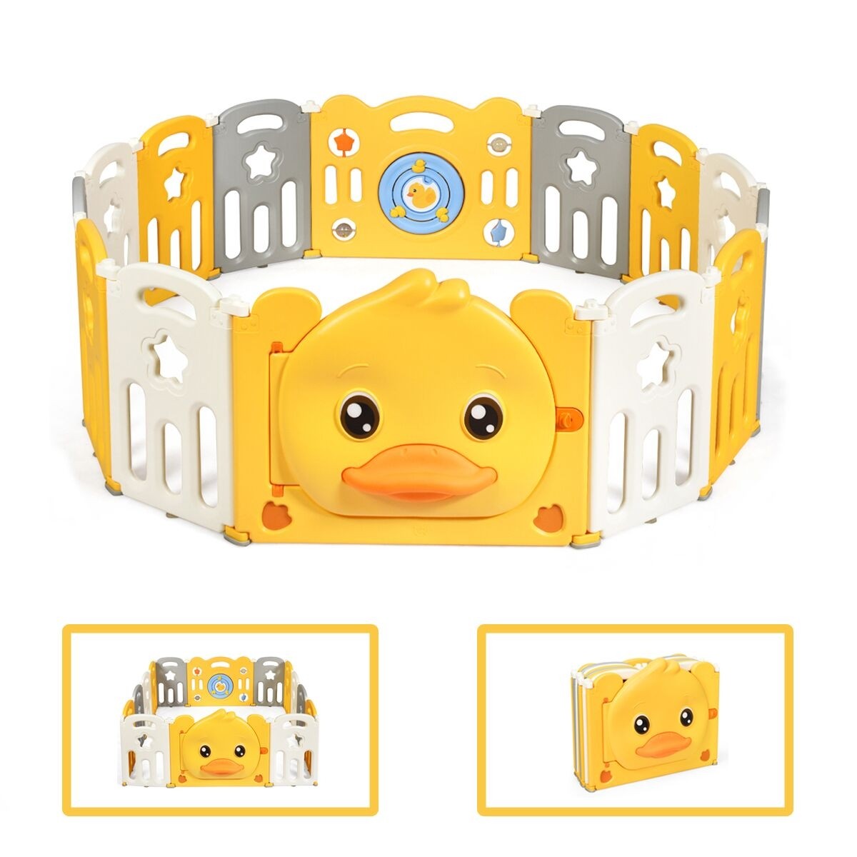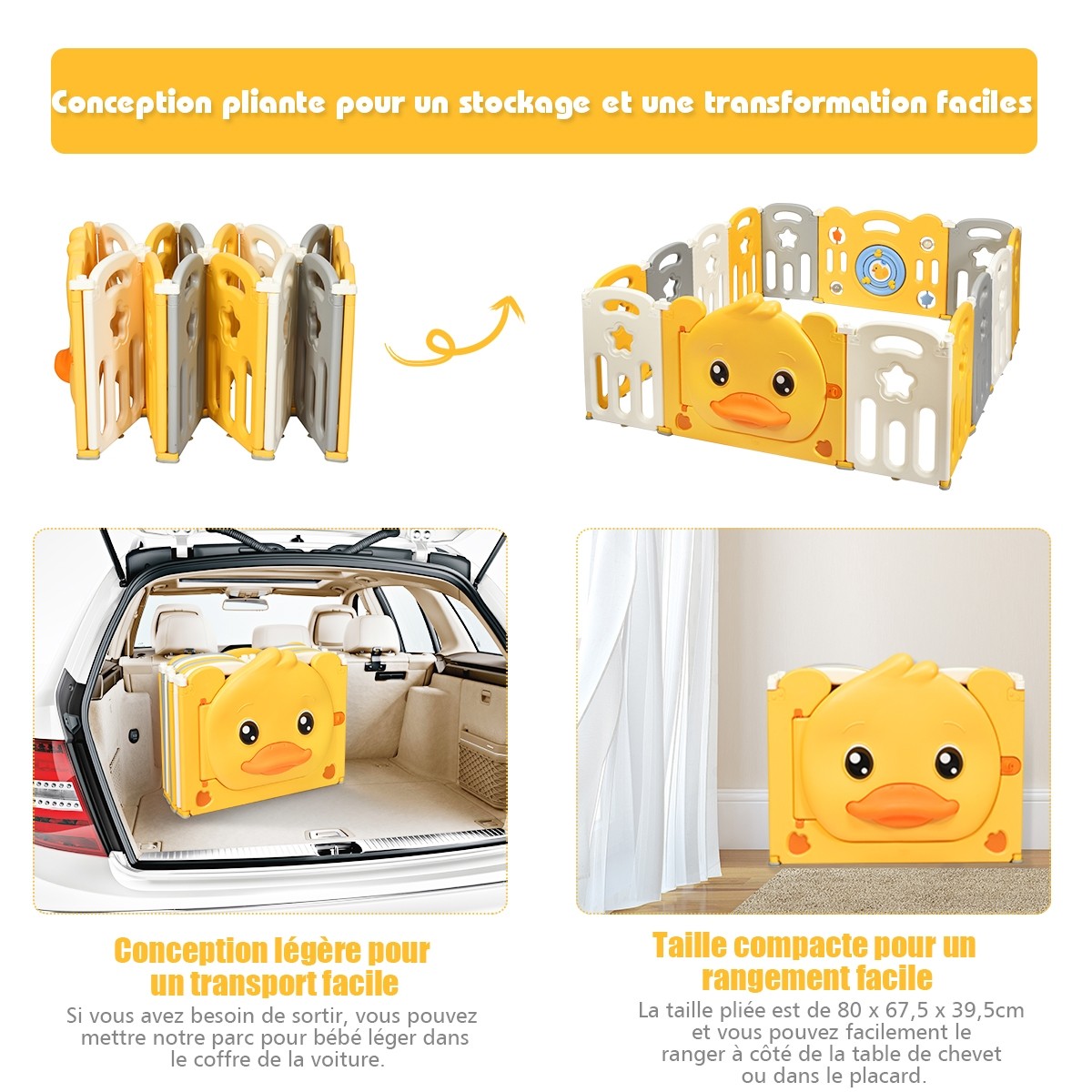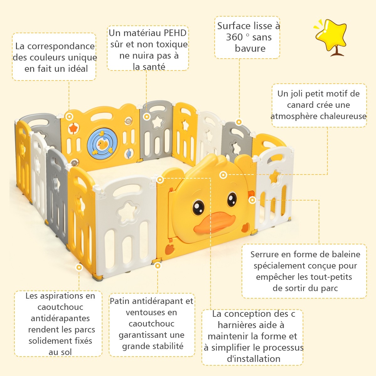 Le parc pour bébé est fait d'un matériau HDPE non toxique et sans BPA pour assurer la sécurité du bébé. Le design de la porte battante avec un verrou de sécurité et une base en silicone antidérapante augmente la stabilité globale. En ajustant le serrage des charnières, vous pouvez changer la forme de la barrière pour s'adapter à des pièces de différentes tailles et fournir aux enfants un grand espace de jeux. Compte tenu de la peau délicate du bébé et de sa sécurité, nous avons soigneusement sélectionné des matériaux HDPE sans BPA et non toxiques. De plus, il y a des patins de pieds antidérapants et des ventouses au bas de la barrière, qui peuvent fixer fermement tous les panneaux entre eux. En les faisant pivoter, notre parc pour bébé peut être transformé en cercles, rectangles, carrés et même en formes irrégulières. Un panneau surélevé de 67,5cm empêchera efficacement votre bébé de quitter le parc. Les patins en caoutchouc antidérapants rendent la barrière moins sujette au déplacement. Ventouses antidérapantes en bas pour fixer solidement tous les panneaux. Facile à assembler, à démonter et à déplacer. Couleur : jaune + blanc + gris Matériau : HDPE Dimensions du produit : 160 x 169 x 67,5 cm (L x l x H) Dimensions barrières : 80 x 67,5 cm Dimensions du petit panneau : 39,5 x 62 cm Épaisseur de la porte de barrière : 6,4 cm Épaisseur du petit panneau : 2,5 cm Poids du produit : 15,85 kg Livraison : 1 x porte de barrière 1 x panneau de jeux 12 x petits panneaux 14 x patins de protection 14 x ventouses 1 x mode d’emploi Attention : Les livraisons se font en France métropolitaine à l'exception des îles qui ne sont pas reliées au continent par un pont (Corse, Ile d'Yeu, etc.). Livraison en 3 à 7 jours ouvrables.