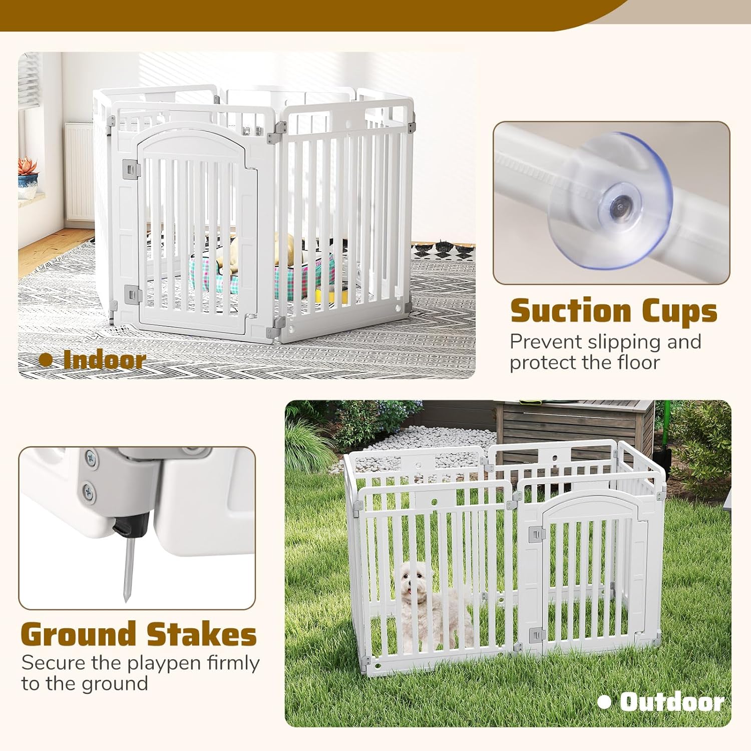 • Sécurité garantie : La porte de cet enclos est équipée d’une serrure, empêchant l’animal de s’échapper accidentellement. En outre, les ventouses ainsi que les 6 piquets de sol fixent fermement la barrière au sol et réduisent les risques de renversement.