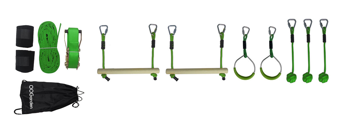 La Ninja line - slak line pourra être installée dans votre jardin et ou en pleine nature lors de vos pique nique. Il vous suffira de l'installer entre 2 arbres matures afin de garantir sa stabilités et d'effectuer les réglages nécessaire en fonction de leur éloignement.Une fois la sangle installée vos enfants pourront s'y amuser à faire les funambules en toute sécurité. Caractéristiques: 1 ninja line verte de 10 m 1 sangle noire de 1,9 m avec cliquet 2 protections d'arbre noire de 11 x 100 cm 2 anneaux métalliques 7 x 120 mm 3 boules de corde 2 trapèzes en bois avec barreau de 3,5 x 40 cm 1 corde tressée de 10 mm de diamètre 9 liens triangulaires galvanisés 1 sac de rangement - facile a transporter Poids maximum conseillé sur la ninja line : 110 kg Convient aux enfants à partir de 6 ans Conforme aux normes EN71