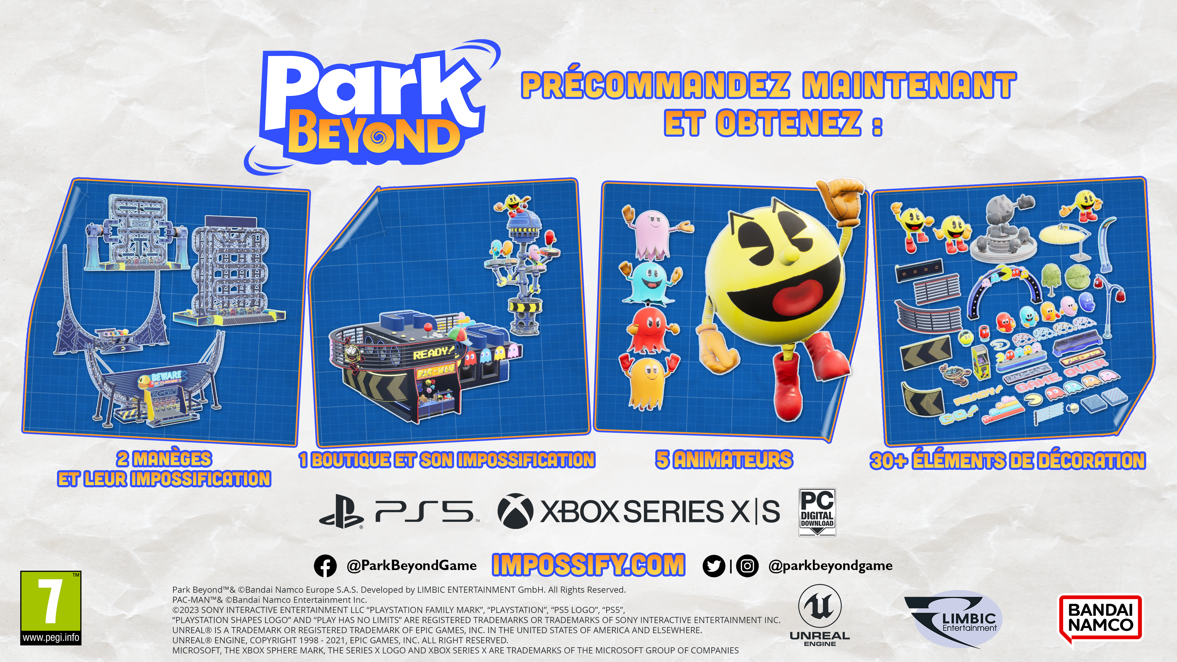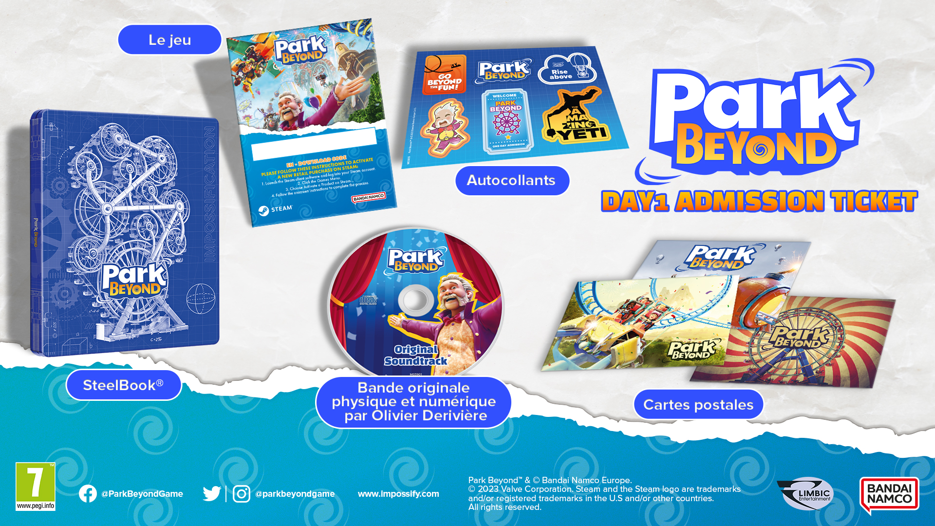 Plus-Produit : Park Beyond Day-1 Admission Ticket Edition contient : - Le jeu. - Autocollants. - Steelbook. - Cartes postales. - Bande originale physique et numérique par Olivier Derivière. Plongez dans la campagne scénarisée et apprenez les bases de la construction et de la gestion de parcs d'attractions. Créez des attractions à couper le souffle grâce à notre éditeur de montagne russe intuitif et facile à prendre en main, et défiez la gravité avec nos différents modules. Le succès de vos parcs est entre vos mains. Recrutez du personnel, gérez vos employés, gardez un oeil sur les différentes cartes densité, consultez les avis des visiteurs, et prenez les mesures qui s'imposent. Créez en toute liberté grâce au mode bac à sable. Si vous ne tolérez aucune limite à votre créativité, sélectionnez l'option fonds illimités, et créez le parc de vos rêves !