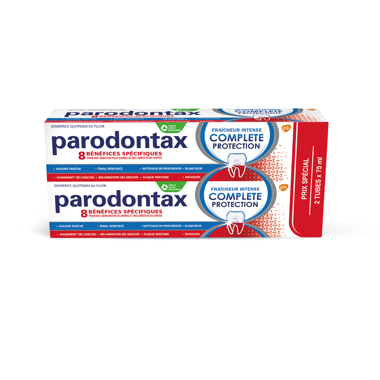Parodontax Dentifrice au Fluor Fraîcheur Intense Complète Protection Lot de 2 x 75 ml est un dentifrice au fluor aux 8 bénéfices spécifiques pour des gencives plus saines et des dents plus fortes. Ce dentifrice vous apporte 8 bénéfices pour des gencives plus saines et des dents plus fortes : - Action blancheur - Nettoie en profondeur - Prévient les rougeurs - Aide à réduire l'inflammation des gencives - Renforce l'émail - Combat la mauvaise haleine - Aide à prévenir le saignement occasionnel des gencives - 4x plus efficace contre la plaque dentaire