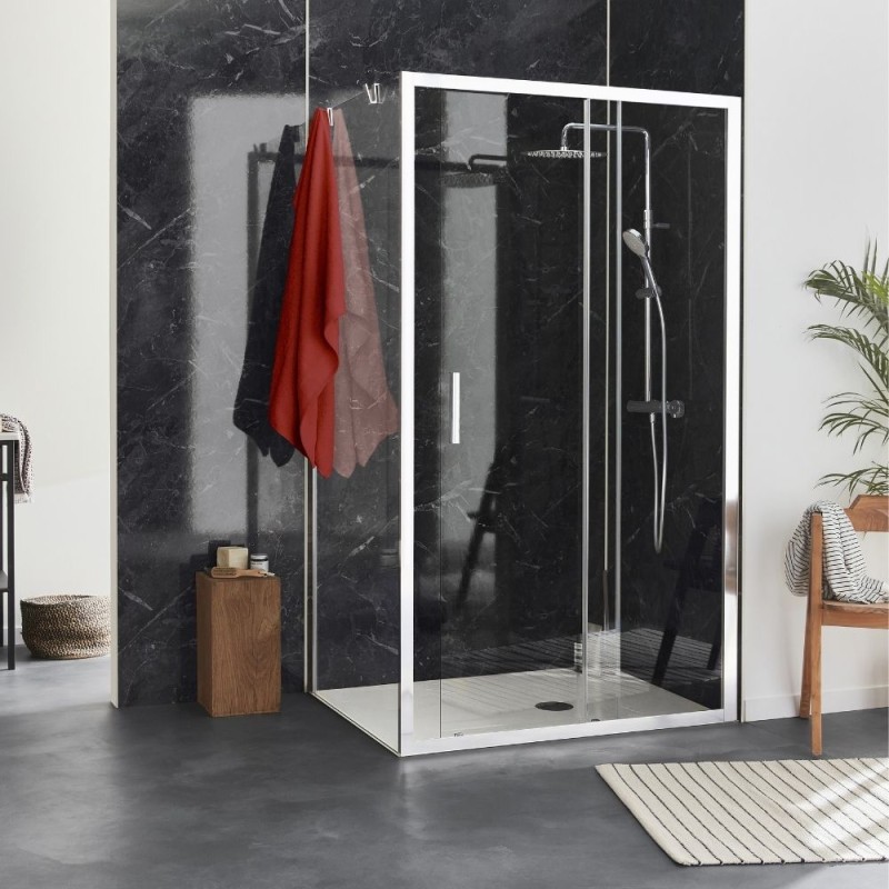 Pack installation angle comprenant 1 porte coulissante, 1 paroi latérale et 2 crochets porte-serviettes