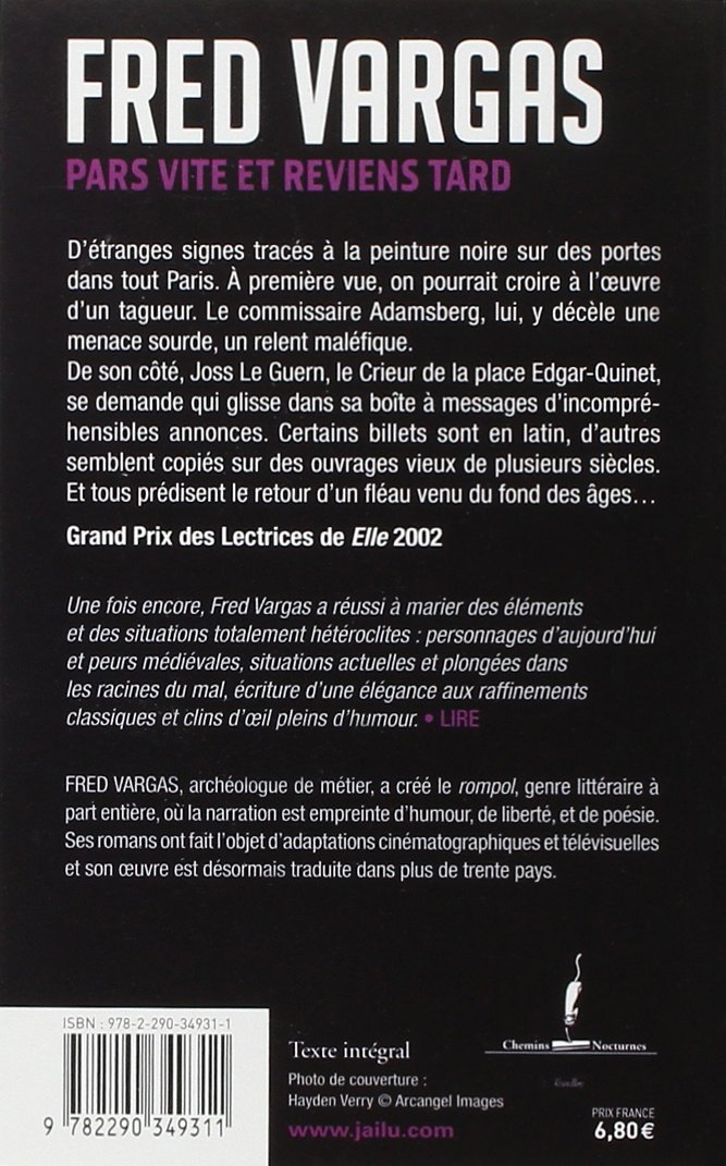 D'étranges signes tracés à la peinture noire sur des portes dans tout Paris. À première vue, on pourrait croire à l'oeuvre d'un tagueur. Le commissaire Adamsberg, lui, y décèle une menace sourde, un relent maléfique.De son côté, Joss Le Guern, le Crieur de la place Edgar-Quinet, se demande qui glisse dans sa boîte à messages d'incompréhensibles annonces. Certains billets sont en latin, d'autres semblent copiés sur des ouvrages vieux de plusieurs siècles. Et tous prédisent le retour d'un fléau venu du fond des âges...
