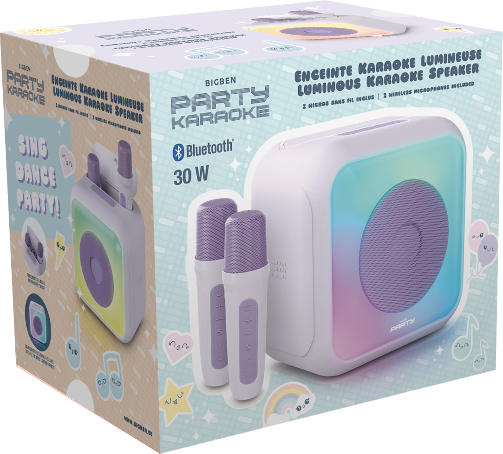 ENCEINTE KARAOKE AVEC 2 MICROS SANS FIL - Bluetooth®5.0 - Puissance musicale totale : 30 Watts - 2 micro sans fil rechargeables avec sons d'animation intégrés - Effets "Voix prioritaire"- Modificateur de voix (grave / aiguë) + effet écho - Réglage du volume - Egaliseur- Nombreux effets lumineux - Entrée USB Lecture - Chargeur USB 5 V — 1 A - Poignée de transport - AUX-IN 3.5 mm - TWS : couplez le avec une même enceinte pour un effet stéréo et doubler les Watts ! - Fonctionne sur batterie rechargeable Li-on 2400mAh (câble de charge inclus) ou sur secteur (adaptateur secteur non inclus)