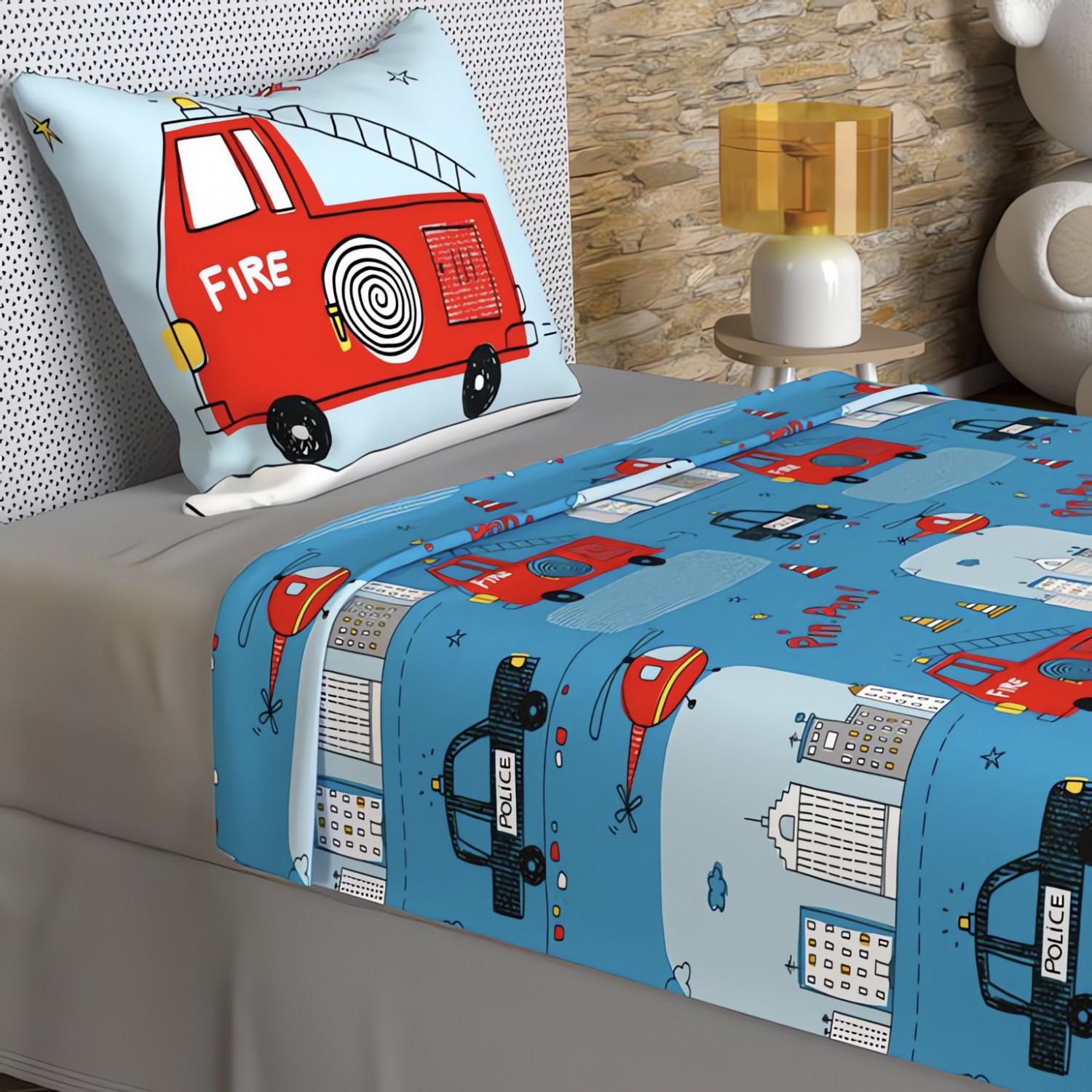 | Libellé | Parure de draps 180x290 cm POMPIERS, 100% coton 57 fils/cm2, par Soleil d'Ocre |