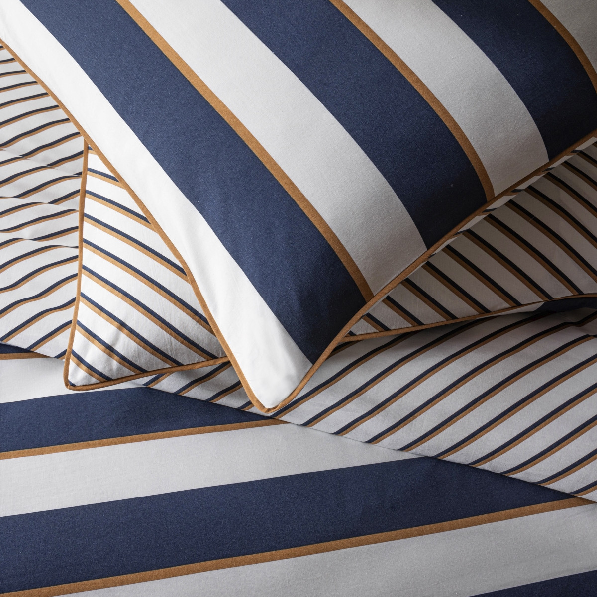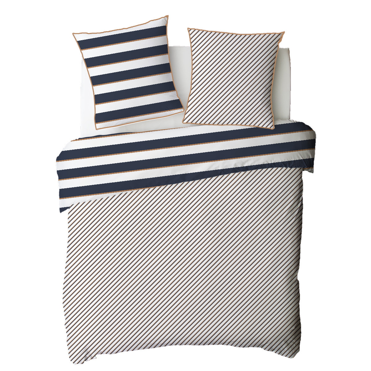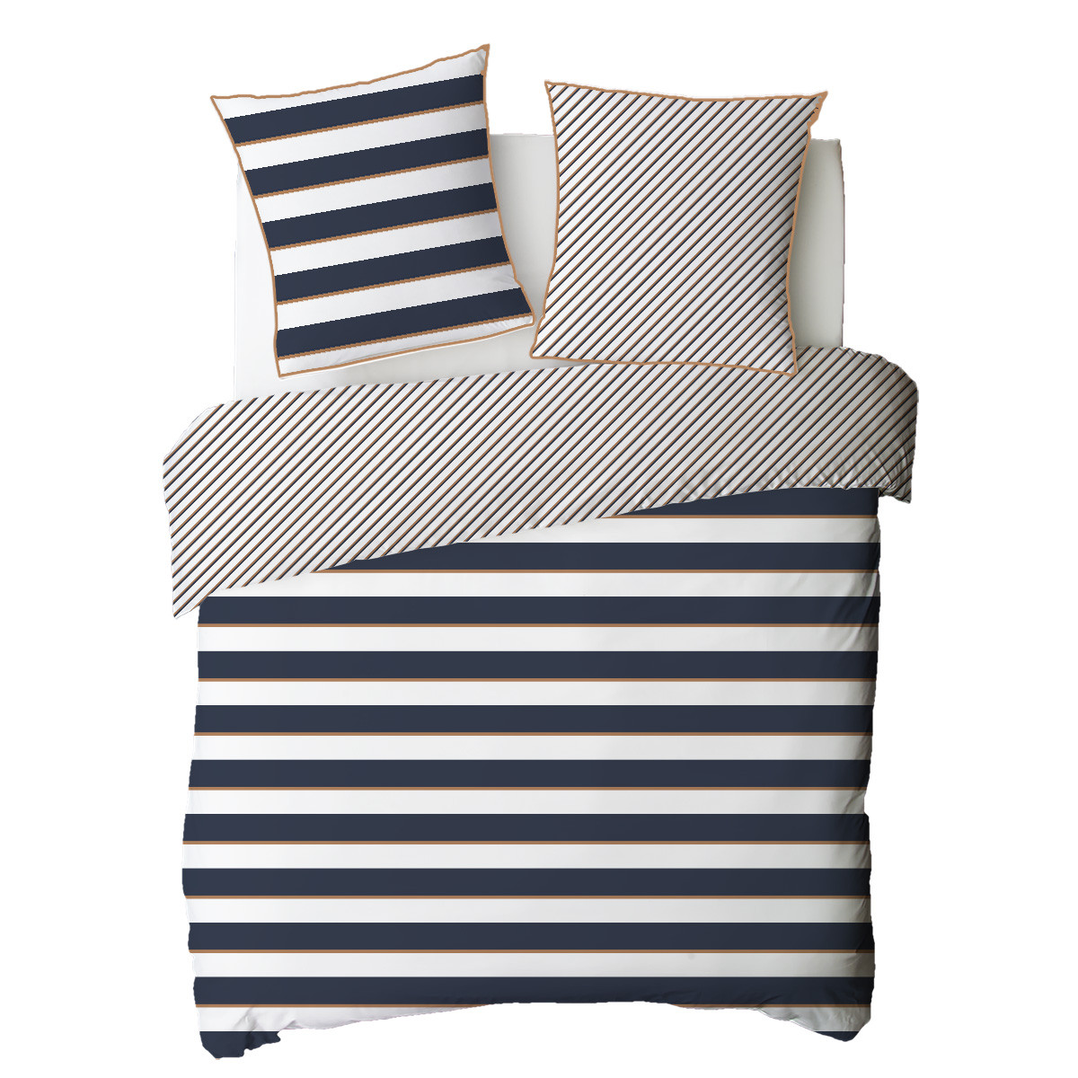 Réversible, elle offre deux designs en un. Rayures bleu-blanc classiques d'un côté, motif rayé subtil de l'autre. Fabriquée en coton 57 fils, doux et durable, elle assure un sommeil réparateur.